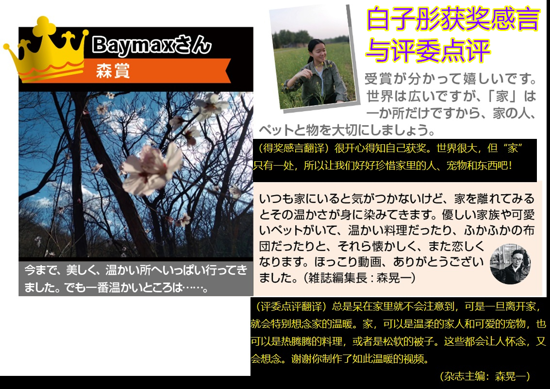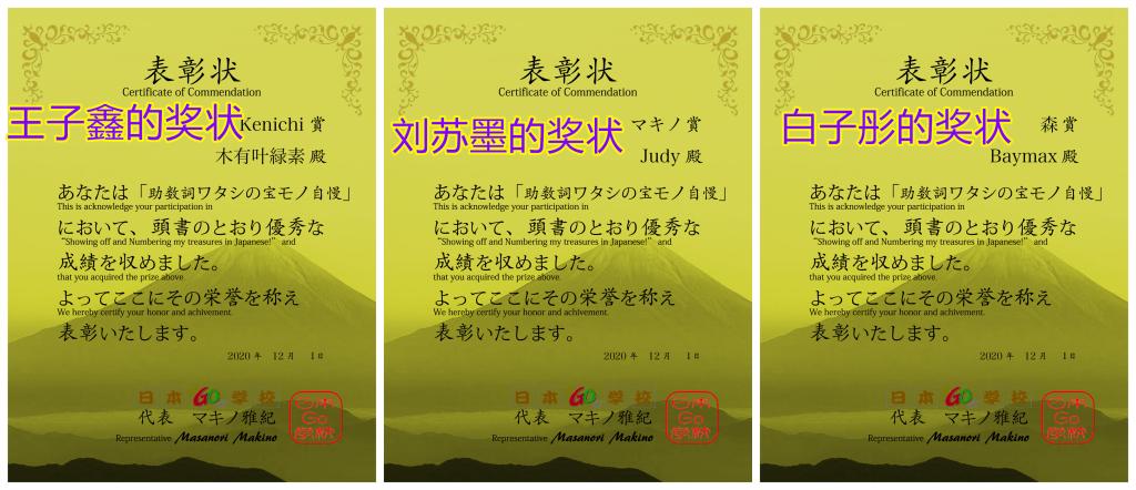 2020年秋季,在日语魏老师的指导下,我校初中日语之星校队学生参加了国际日语量词大赛。为鼓励创意,该比赛不设一二三等奖,一共设有6个评委奖(奖项以评委名字命名)和1个读者奖,共计7个奖。我校初二(9)班的白子彤(参赛姓名:Baymax)、刘苏墨(参赛姓名:Judy)和王子鑫(参赛姓名:木有叶绿素)在多国选手中脱颖而出,斩获3个评委奖,占全部奖项的近半数!他们的获奖感言还得到了12月份发行的《Whenever 广东》杂志报道。