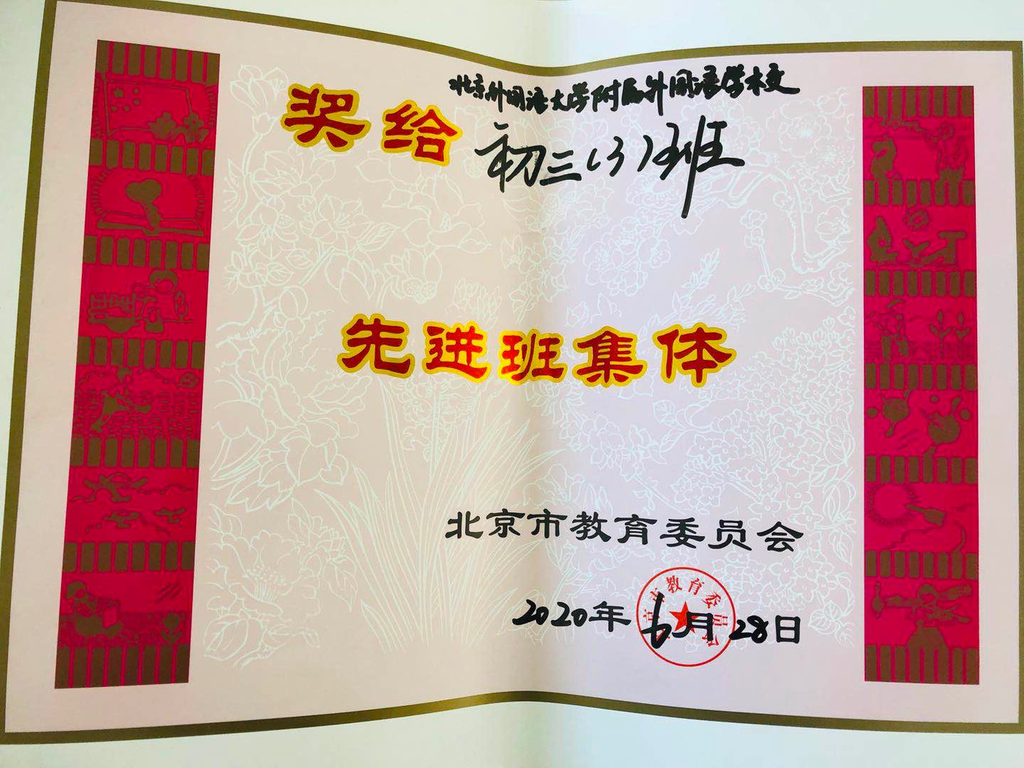 我校2020届初三(3)班荣获北京市“先进班集体”荣誉称号