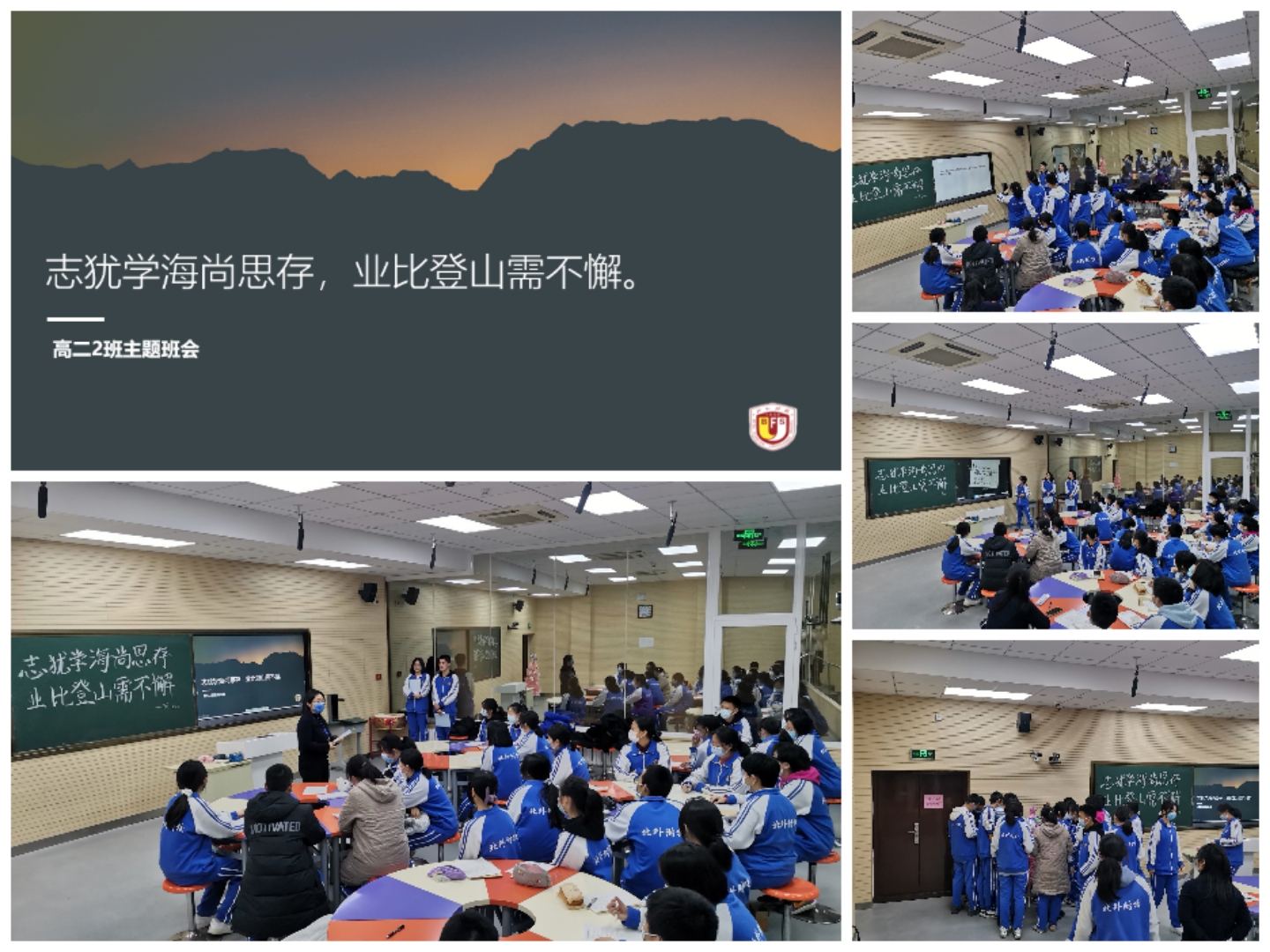 12月29日下午第九节课,班主任李妍老师带领高二(2)班在录课室召开了以“志犹学海尚思存,业比登山需不懈”为主题的班会课, 主持人是潘婧文和唐文浦两位同学。班会开始前主持人就抛出一个问题“你有目标吗?”并分享了在班级内调查的数据,紧接着向同学们展示了哈佛大学做过的一个类似的调查及长达25年之久的跟踪反馈,结果发现他们的生活状况呈现了一定的规律:有自己清晰长远目标那3%的人几乎都成为社会各界精英、领袖; 有清晰但比较短期目标的那10%是各专业领域的成功人士,事业有成; 那60%,成为社会大众群体,平凡地生活着; 那只有一些模糊目标的27%的人生活不如意,工作不稳定,抱怨社会不公平。借此可以得出一个结论——确立什么样的志向,拥有什么样的人生。第二个环节是答题小游戏。每组派出一名代表,大家一起进入古今能人明确自己志向并为之努力的故事。接着进入第三个环节:给未来的自己设计名片。在自己未来的名片上呈现自己未来的职业、岗位、荣誉称号等等。活动结束邀请同学们分享自己的名片,通过同学们的分享,可以看到同学们对自己的未来已经有了明确的目标,那目标是否得以顺利实现,还要取决于在这个过程中的努力与坚持。接着主持人以短视频的形式向同学们介绍了一位同龄人为实现自己志向而努力奋斗的故事,故事的主人公从七八岁开始就把自己的志向化为了持续不断的行动,这中间有身边人的嘲笑和质疑,有对未来的迷茫和无助,但最终还是坚持下来,站上了自己梦寐以求的舞台。“面对质疑、嘲笑,面对在实现这项工作中可能遇到的各种困难阻碍,你是否已经做好的足够的准备?”带着主持人提出的新问题,在主持人的引导下,同学们在自己的“未来名片卡”上郑重写上自己的誓言,并将它挂到了班级准备的成长之树上。
