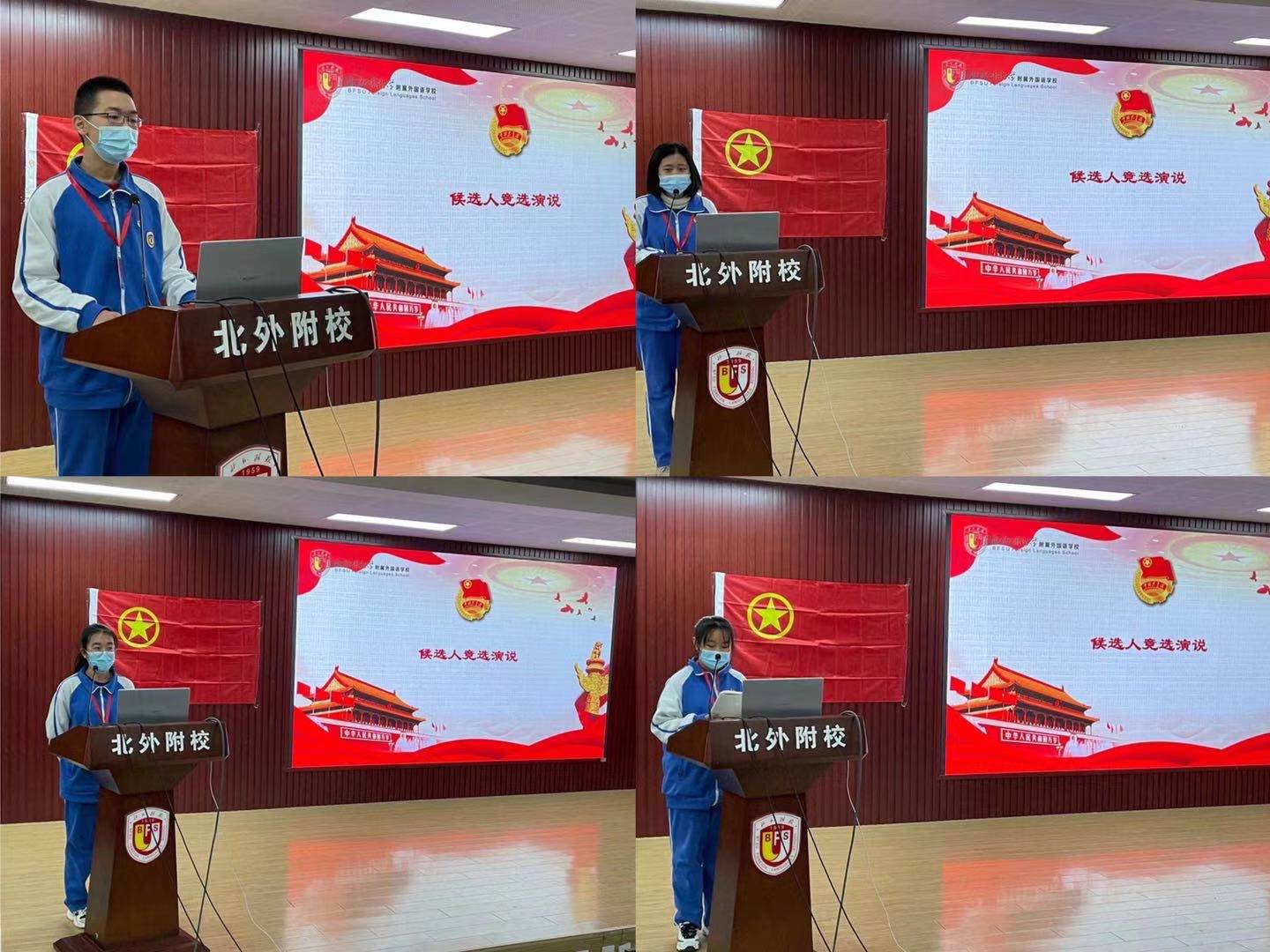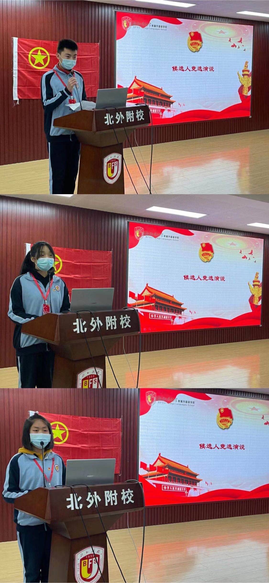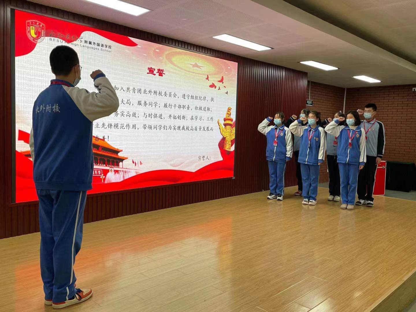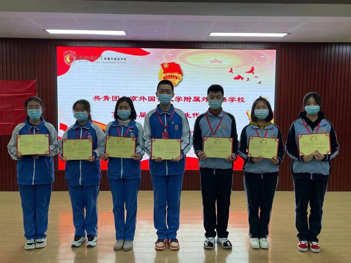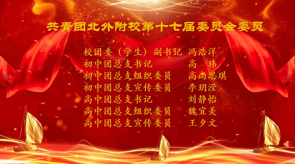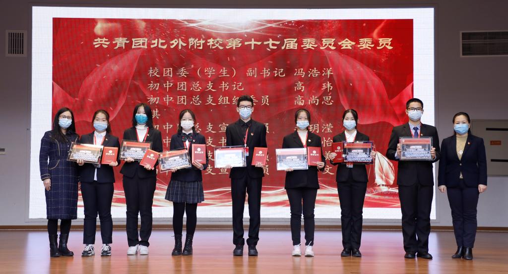 共青团北外附校第十八届团员代表大会二次会议审议并通过了选举办法、委员候选人名单等有关事项,选举产生了共青团北外附校第十八届委员会委员。经过公平、公开、公正的选举投票,万育同当选为校团委(学生)副书记、益安来当选为初中团总支书记、黄天雨当选为组织委员、李麦琪当选为宣传委员、李南熹当选为高中团总支书记、翟艺凡当选为组织委员、周雨歆当选为宣传委员。随后,校团委书记潘铎轩为新任团委委员颁发聘书。所有新任委员在万育同同学的带领下共同宣誓,坚决履行干部职责,积极进取、刻苦努力, 精诚团结、务实高效、与时俱进、开拓创新,在学习工作中树立先锋模范作用。
