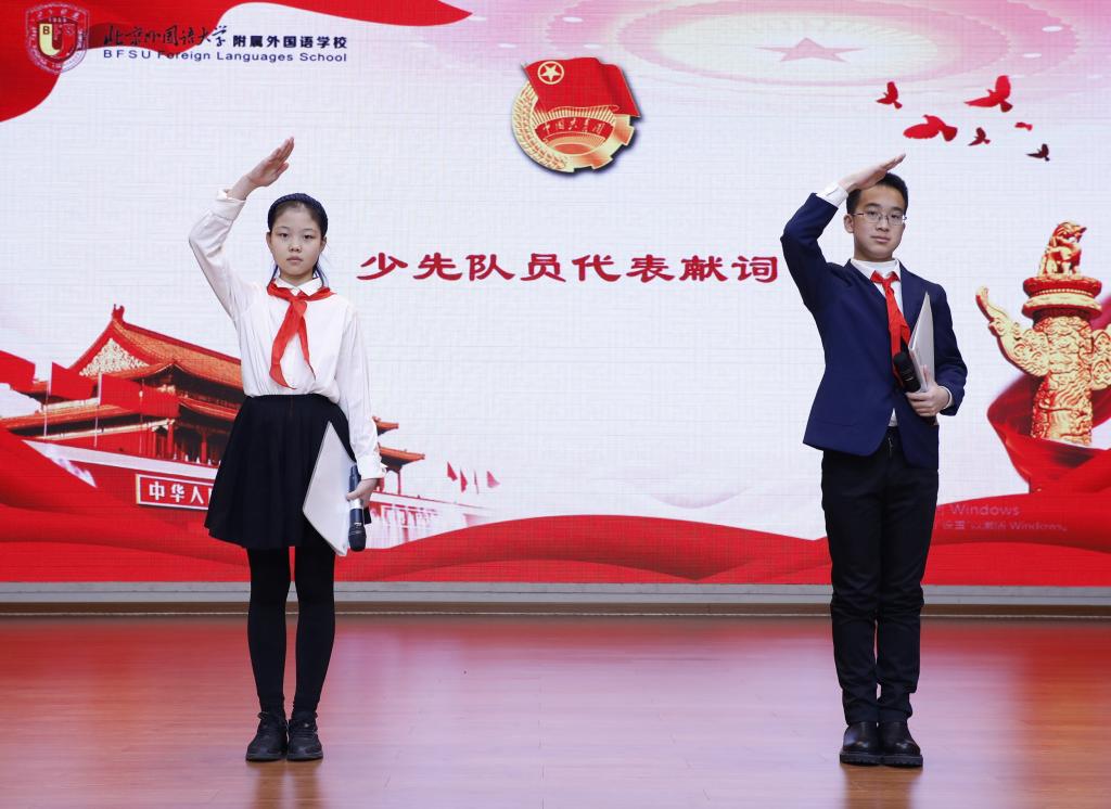 “团徽熠熠映红了年轻的面庞,歌声嘹亮张扬着青春的力量,在我心中,共青团是跃动的火,激燃信仰的力量。”我校2020年度“十佳优秀少先队员”和“红领巾奖章”获得者代表初一(4)班李佳莹和初一(10)班安晋辉同学作为少先队员代表献词。他们代表全校少先队员向大会祝贺,并献上少先队最崇高的队礼!