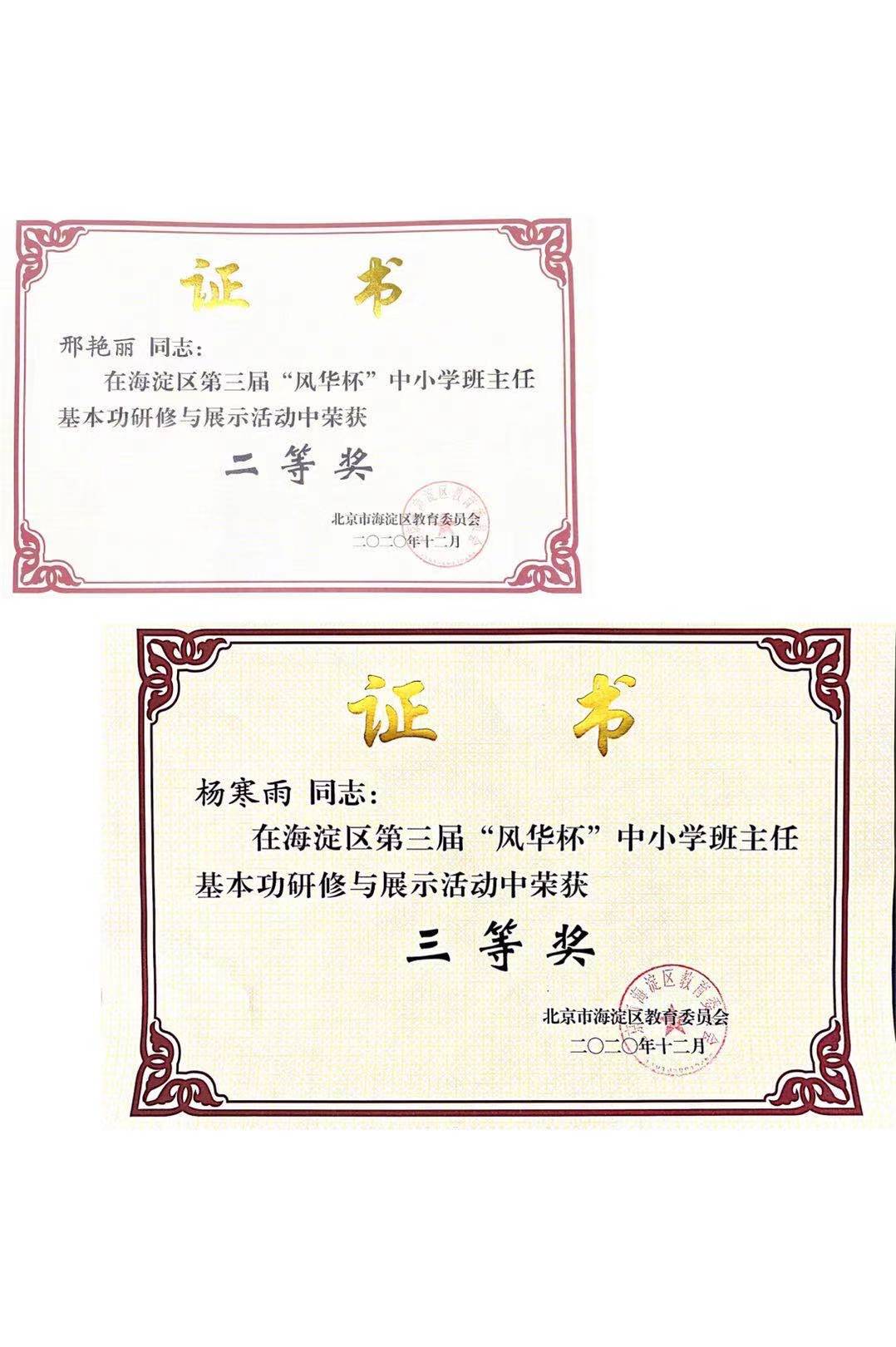 近日,海淀区第三届“风华杯”中小学班主任基本功研修与展示活动获奖名单出炉。我校青年班主任邢艳丽老师及杨寒雨老师分别荣获二等奖及三等奖。