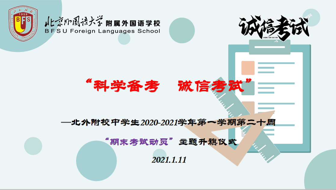 2020-2021学年第一学期期末考试即将来临,为了弘扬诚信精神,以积极乐观,诚实守信的态度去面对考试,我校举行了以“科学备考 诚信考试”为主题的期末动员升旗仪式。本次负责升旗的班级是高一3班。