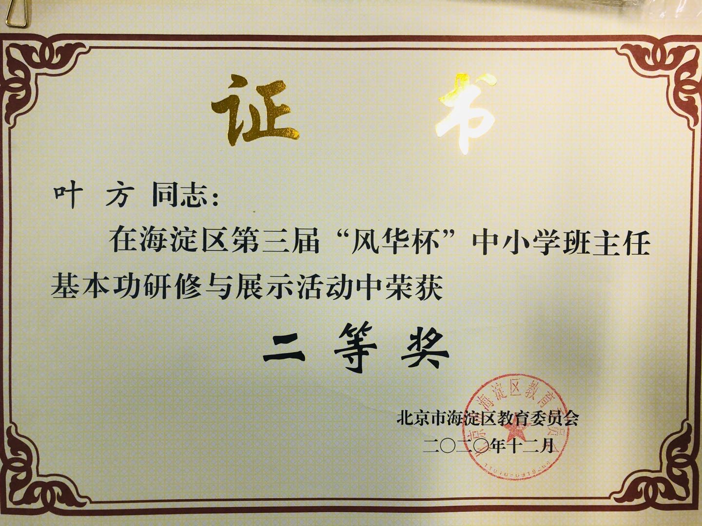 近日,海淀区第三届“风华杯”中小学班主任基本功研修与展示活动获奖名单出炉,我校班主任叶方老师荣获“二等奖”。