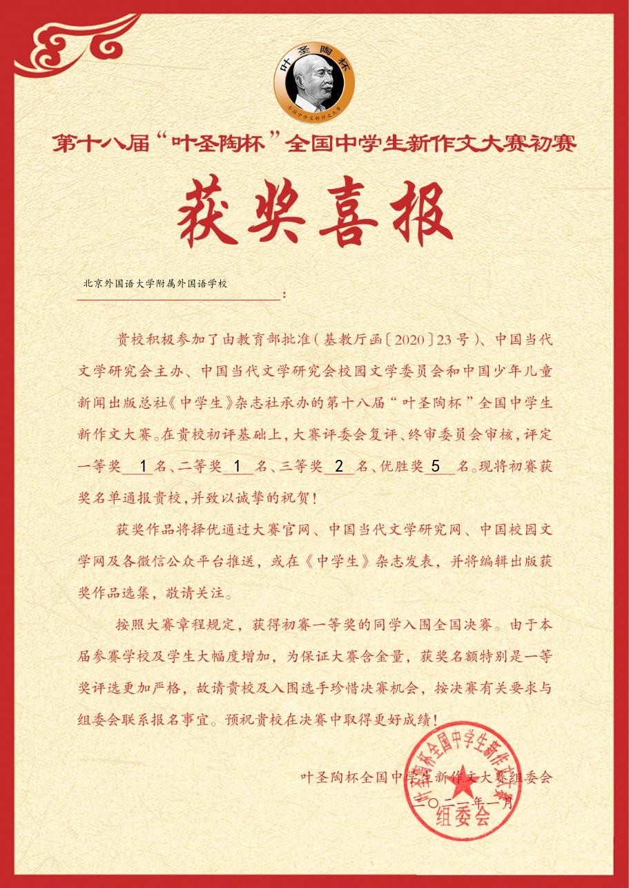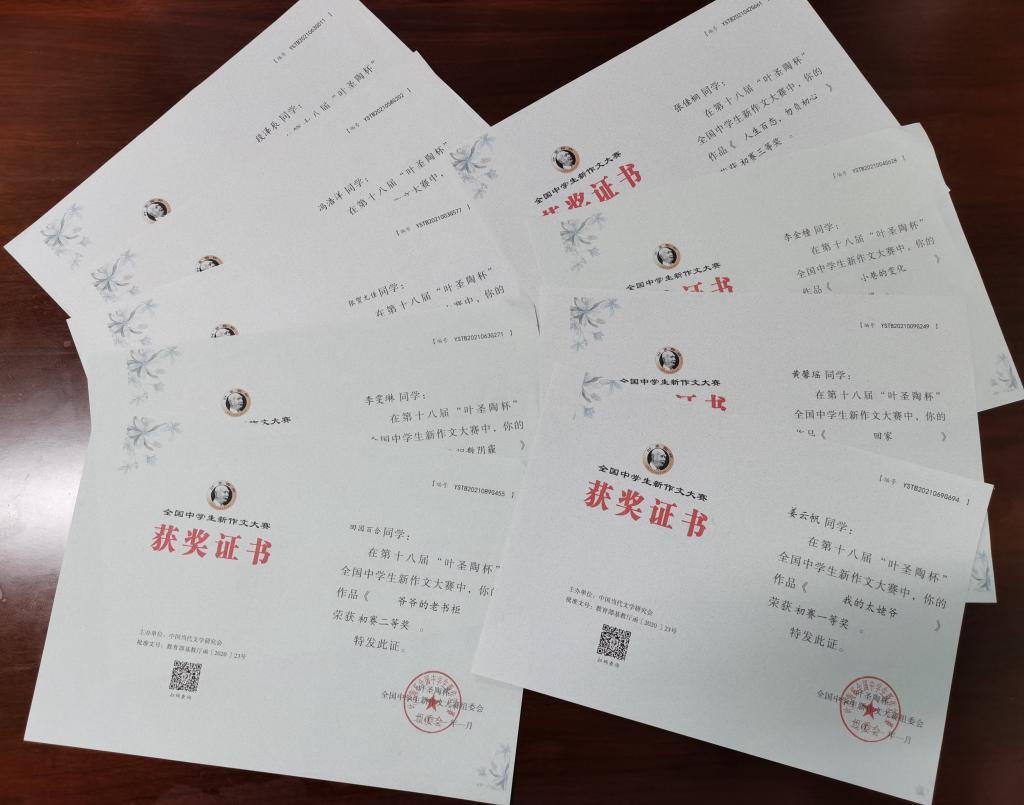 近日, 第18届“叶圣陶杯”全国中学生新作文大赛初赛获奖名单揭晓。我校高中生凭借扎实的文学功底和良好的文学素养,在初赛中取得佳绩,共计9名同学获得初赛一、二、三等奖以及优胜奖。