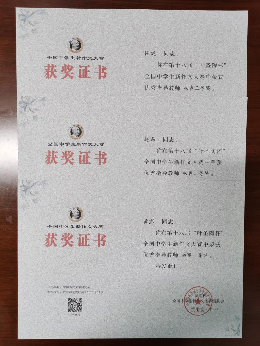 我校高中生共计53人参加本次比赛,获奖的9名同学中,姜云帆同学获一等奖;田园百合获二等奖;张佳桐、李金橦获三等奖;李雯琳、黄馨瑶、张贺尤佳、冯浩洋、段泽辰获优胜奖。获得一等奖的同学将有资格参加第18届“叶圣陶杯”全国中学生新作文大赛决赛。另外,我校高中语文组任健、赵璐、黄露老师被评为优秀指导教师。