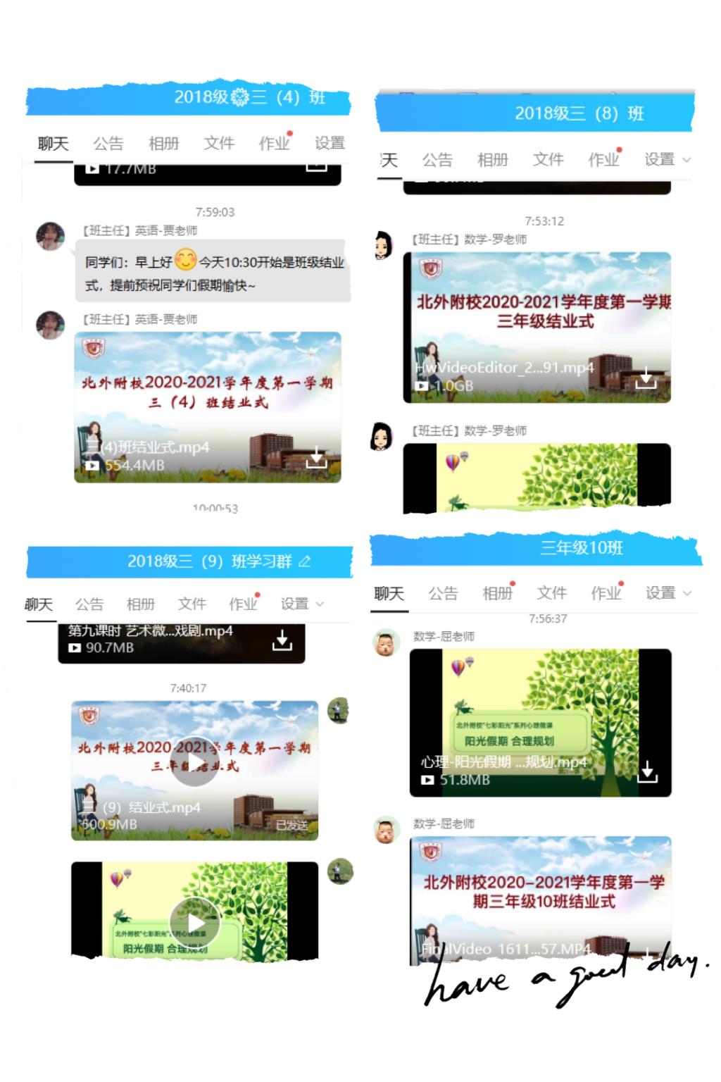 随后,各班举办了个性化结业仪式——由同学们分享居家生活的精彩视频。有的同学详细介绍了自己的寒假规划,有的同学展示了自己运动时的风采,有的同学分享了自己的假期阅读计划,有的同学秀出了自己新学会的劳动技能……同学们和班主任一起回顾了这一学期走过的路,不平凡的2020年给师生们留下了太多回忆。