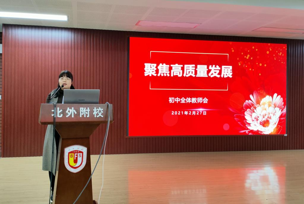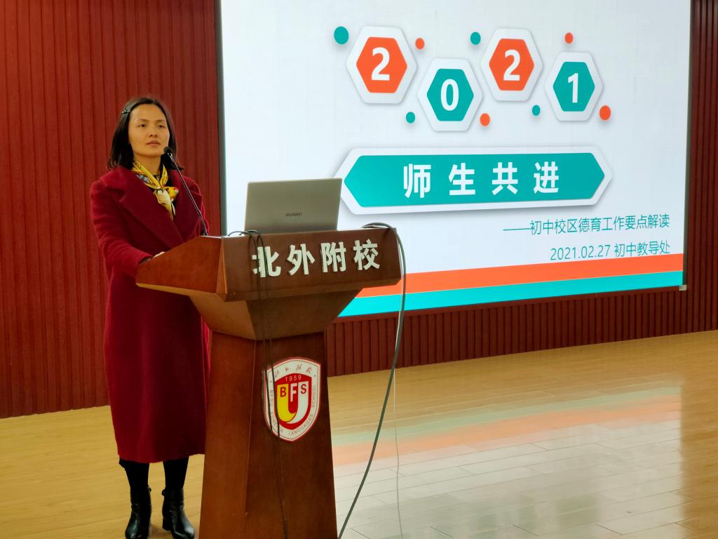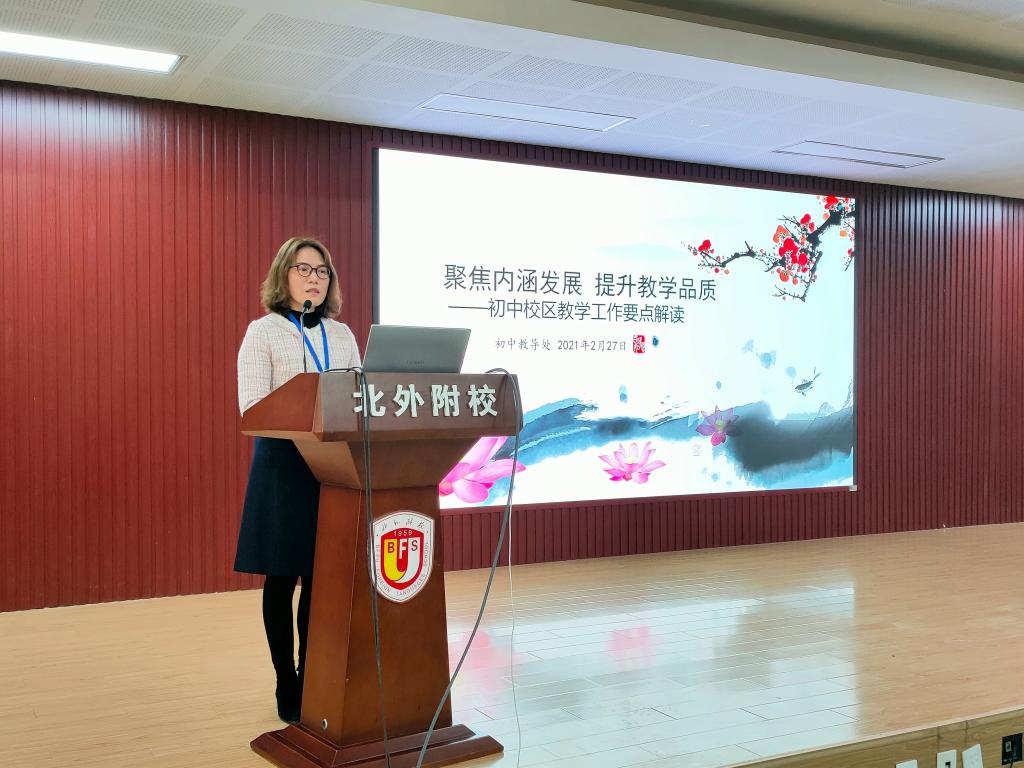 接着,初中校区教导处主任王莉以“聚焦内涵发展,提升教学品质”为主题对初中校区新学期教学工作要点进行了解读。王莉从同课异构——教学设计力、外语节——活动设计力、中考备考——评价设计力三个方面展开了分析。随后,初中校区教导处副主任章继华从教师发展、学生成长、成果征集三个维度解读了新学期初中校区德育工作要点。