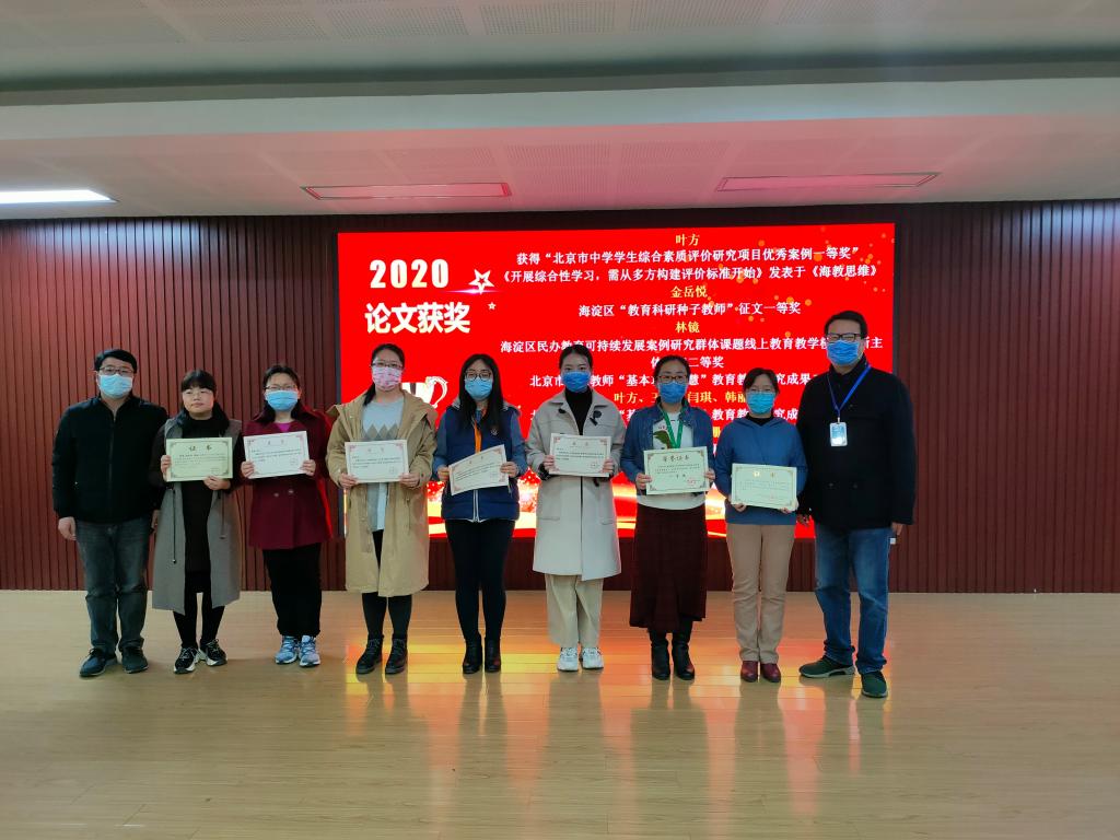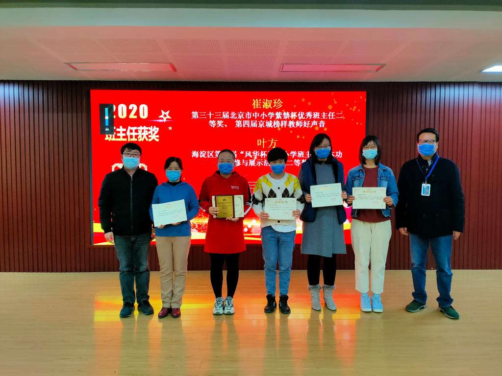 会上对2020年北京市班主任紫禁杯、海淀区班主任基本功竞赛获奖、论文获奖、辅导竞赛获奖及获得其他奖项的教师团队及个人进行了表彰,林卫民、杨磊为获奖教师颁发证书。