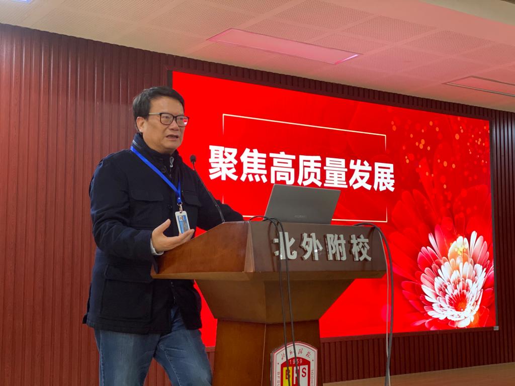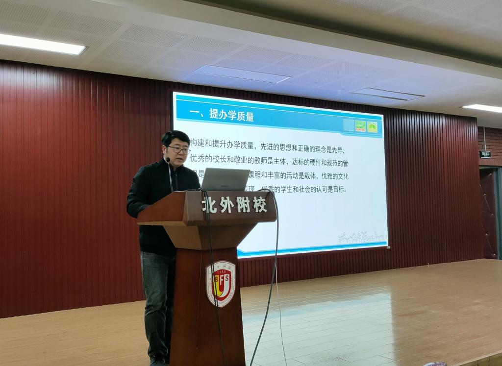 首先,杨磊为全体教师布置新学期重点工作,提出要办更有品质的初中。杨磊围绕“提办学品质”、“促教师发展”、“为学生赋能”三个方面对发展方向进行剖析。在“提办学品质”这一部分,杨磊对提办学品质的必要性、如何构建和提升学校品质、学校品质提升的特点进行了介绍。当谈到“促教师发展”这一话题时,杨磊强调要培养、发展教师队伍,提出了相关举措,并引出了深度学习这一概念,分析了深度学习与核心素养、深度学习与单元教学之间的关系。关于“为学生赋能”,杨磊从教师、班主任、家长三个层面对如何实现为学生赋能提出了切实可行的参考建议,强调要在规则范围内开展教育教学活动。之后,杨磊对本学期中考与招生两大重点工作及开学工作进行了部署,号召教师们携手奋进,共同迎接新学期的到来,在新学期谱写新的篇章。