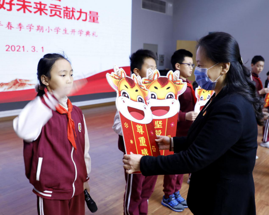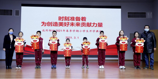 最后,林卫民校长和张继军书记为同学们送上了象征北外附校小学生优秀品格的吉祥牛,每一头可爱的小牛都蕴涵着老师们对孩子们的殷殷期盼和美好祝愿。