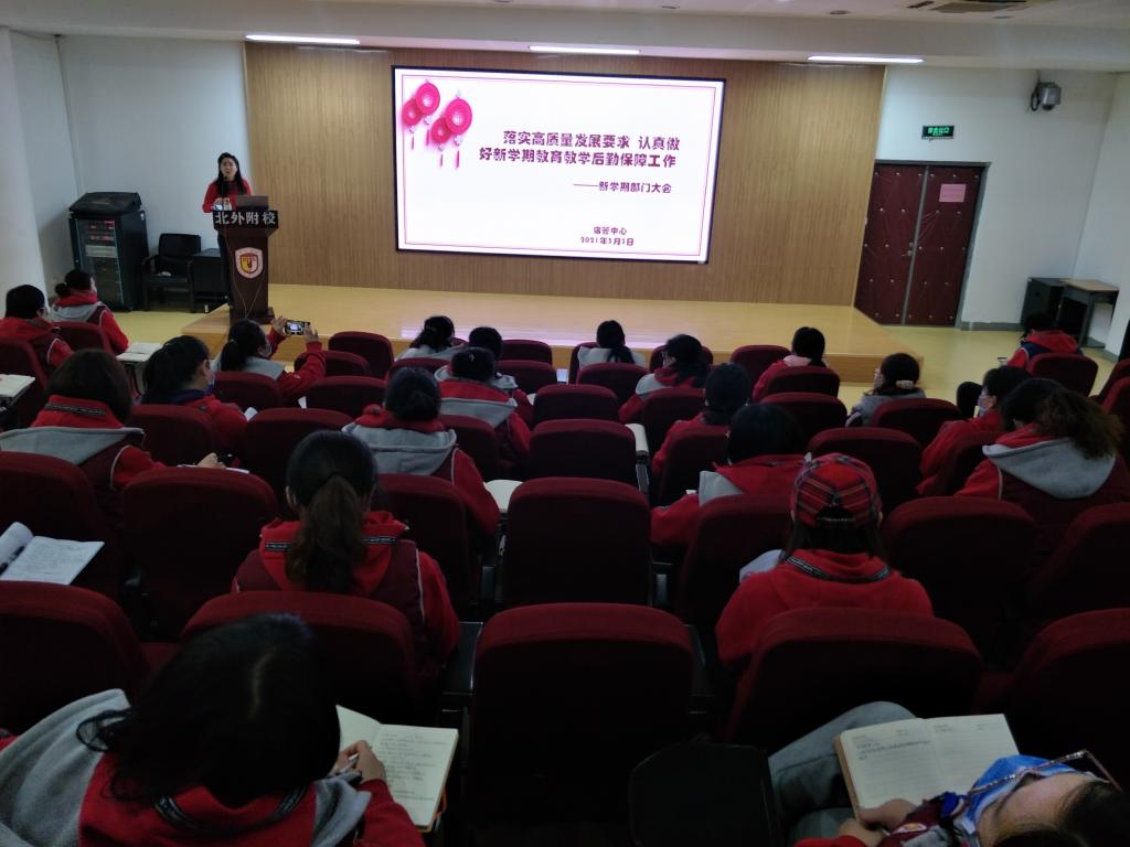 在新学期工作开始之际,于3月3日9:30,北外附校宿管中心新学期部门大会在一阶召开,参加本次大会的有宿管中心主任李洪杰、全体生活教师及医务室大夫。大会由丁建枝老师主持。