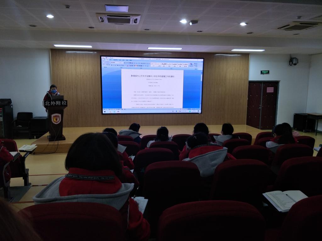 首先丁老师解读了由教育部办公厅下发的关于加强中小学生手机管理文件资料。为保护视力,让学生安心学习,防止沉迷电子游戏,促进身心健康发展,对学生手机管理有了明确的要求。