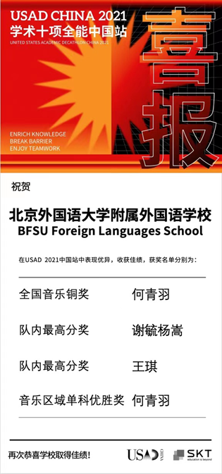 我校PGA国际课程班3组同学参加美国学术十项全能竞赛近日传来捷报,其中何青羽获得了全国音乐铜奖,谢毓杨嵩和王琪获得队内最高分。