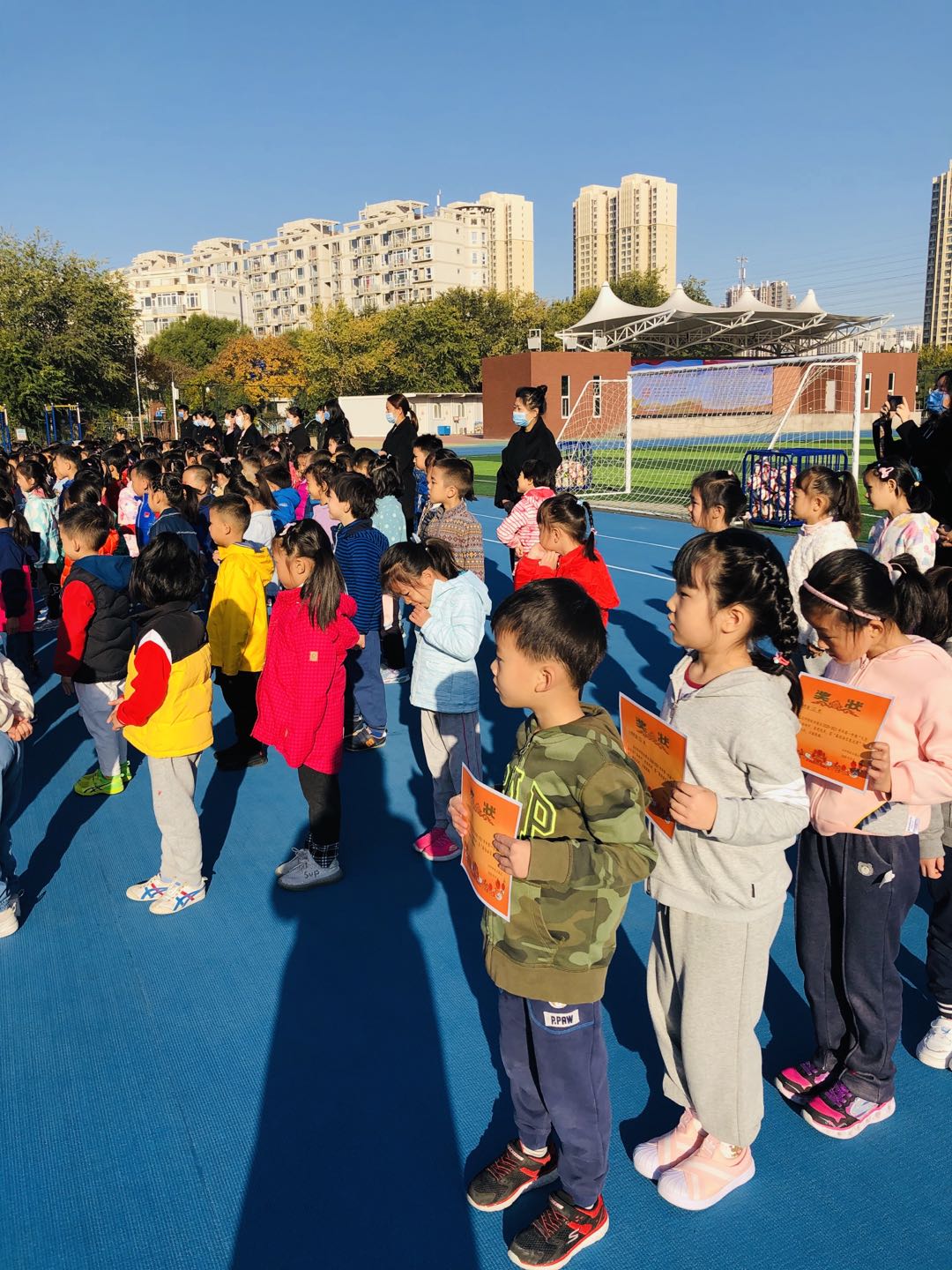 在升旗仪式之后进行了颁奖典礼,小学副校长、社区办园点园长孟娜为“九月语言月”获奖班级颁发奖状,并合影留念。