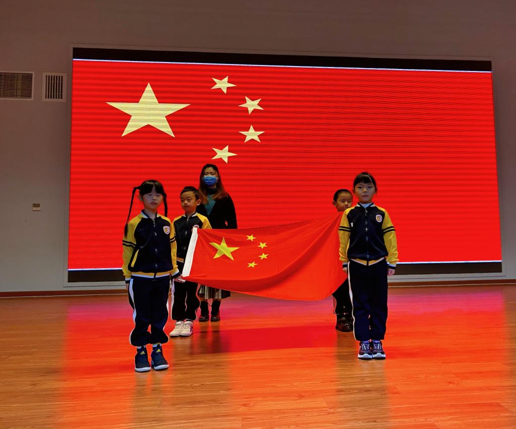担任本周升旗仪式的主持人是来自小幼衔接(5)班的于和小朋友与田忆恩小朋友。在主持人用中英双语宣布升旗仪式开始后,由小幼衔接(5)班的刘子衿、谢子墨、赵德馨、翟一墨等四位小朋友组成的护旗队出旗。孩子们面对着鲜艳的五星红旗,行注目礼,齐声高唱国歌。