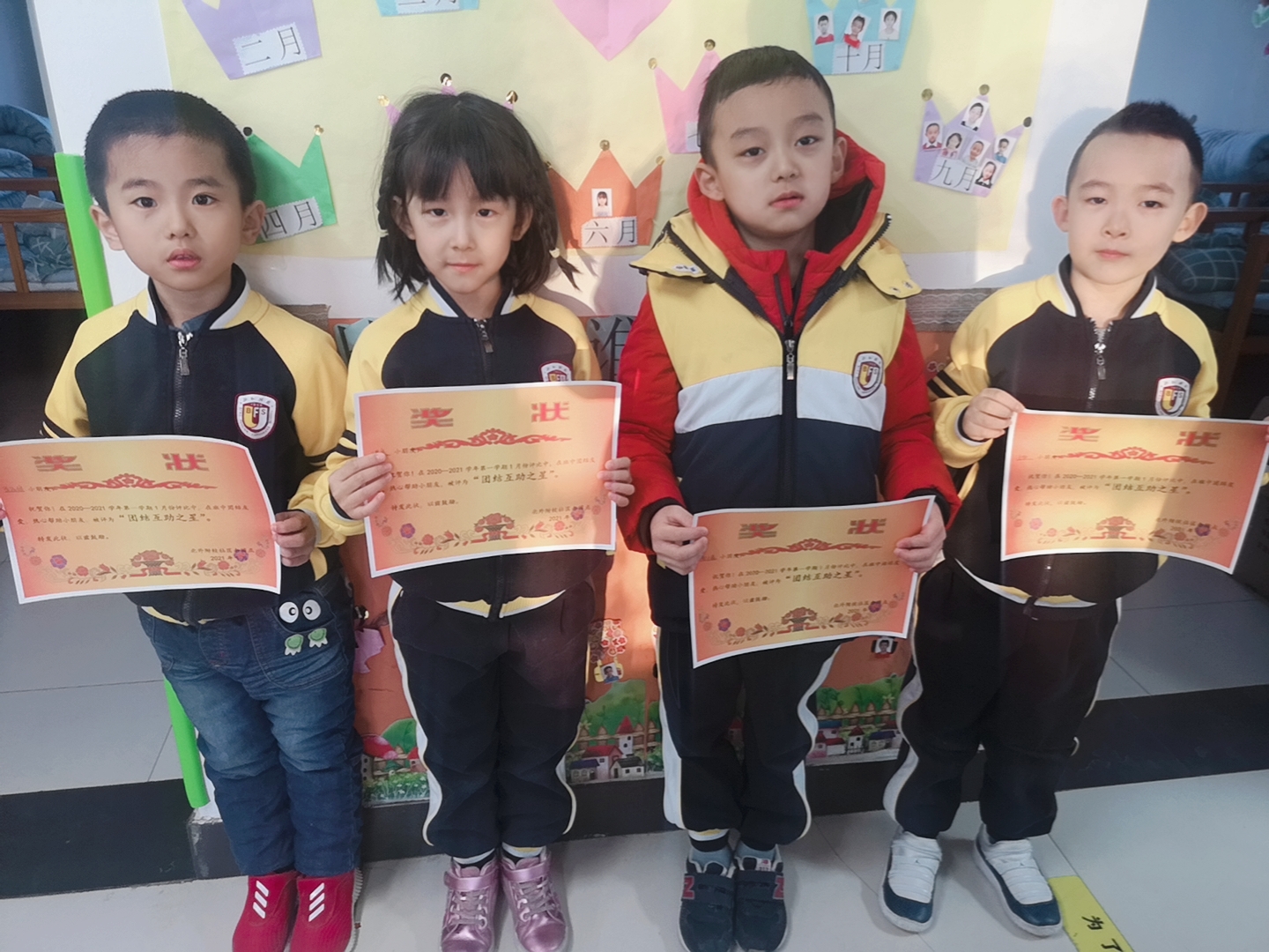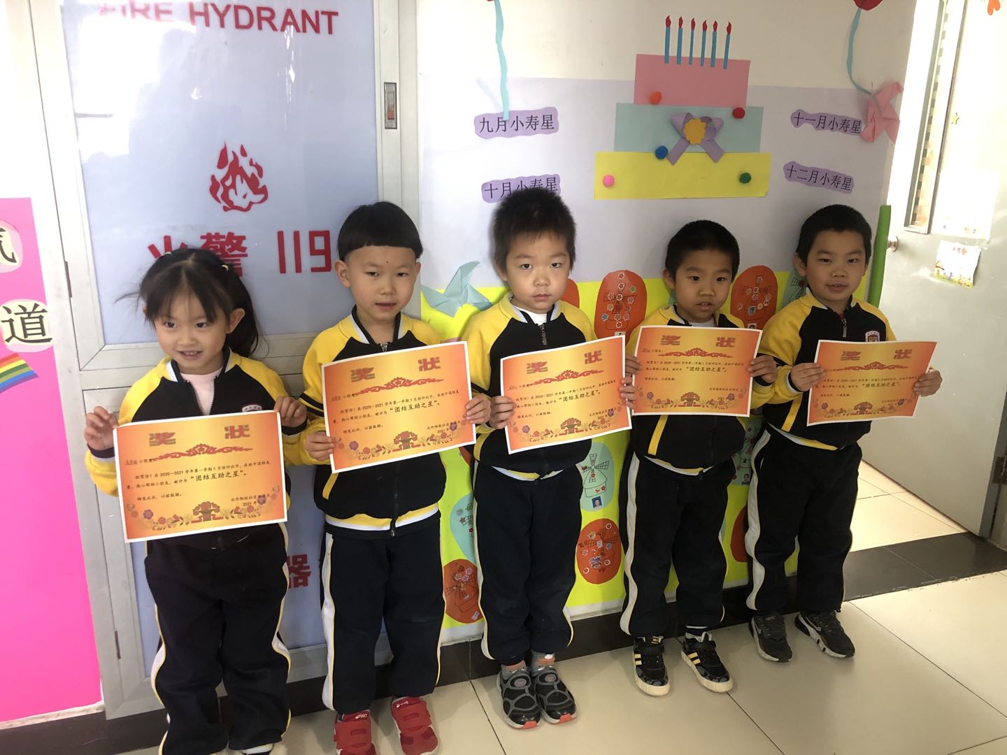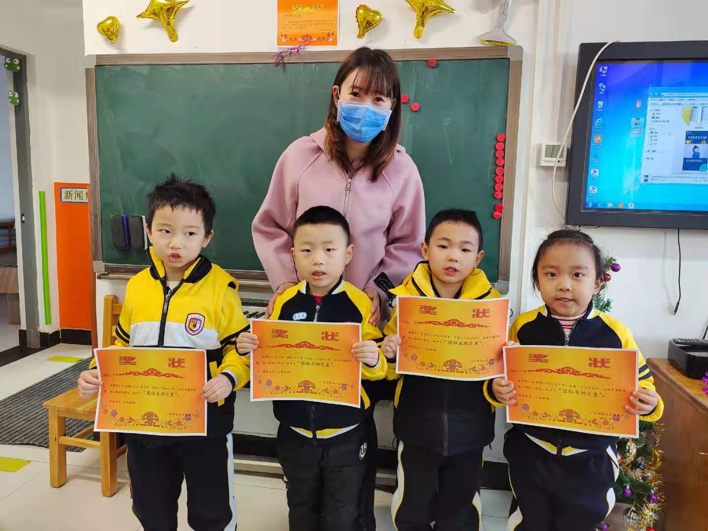 在颁奖环节中,共有32名小朋友获得“团结互助之星”称号,班主任为获奖的小朋友颁发奖状。