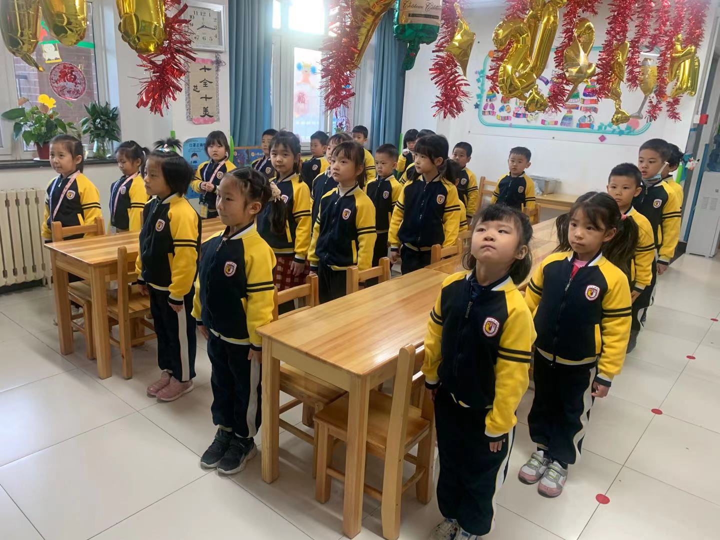 担任本周升旗仪式的主持人是小幼衔接(3)班的张峻豪和吴雨馨小朋友。升旗仪式开始,庄严的国歌在广播中响起,全员师生在教室列队站好,面向国旗高唱国歌,注视着五星红旗冉冉升起。
