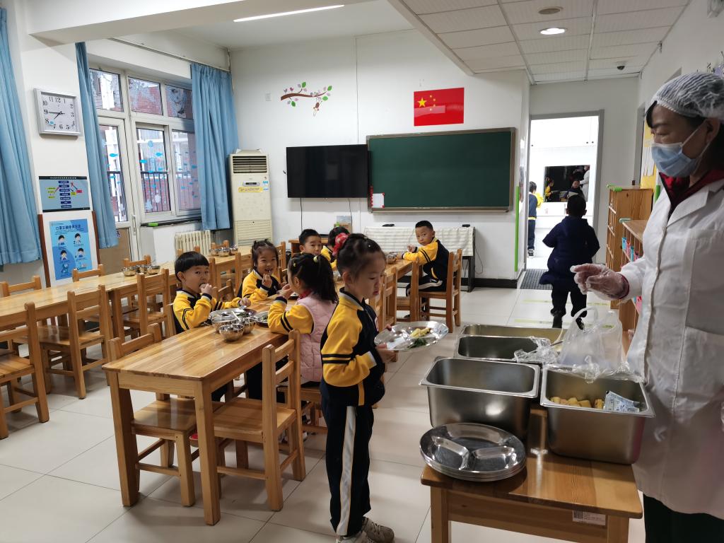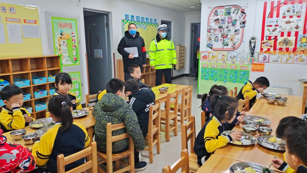 教室里,久违的饭菜味道,深深吸引着小朋友们,孩子们吃得津津有味。看到前来慰问的交警叔叔,扬起稚气的笑脸,礼貌地向叔叔挥手问好。