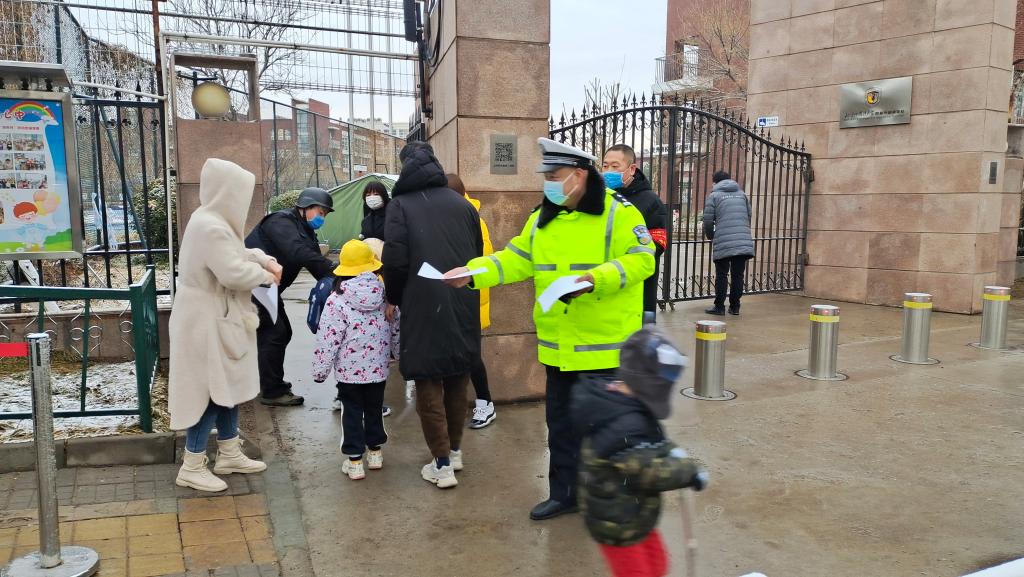 开学当日,交警队的叔叔一大早就站在园门口,维持交通秩序,宣传交通安全知识,校医和老师们测温检查,把好入园第一关。保安叔叔们也全副武装,为孩子们的安全保驾护航。