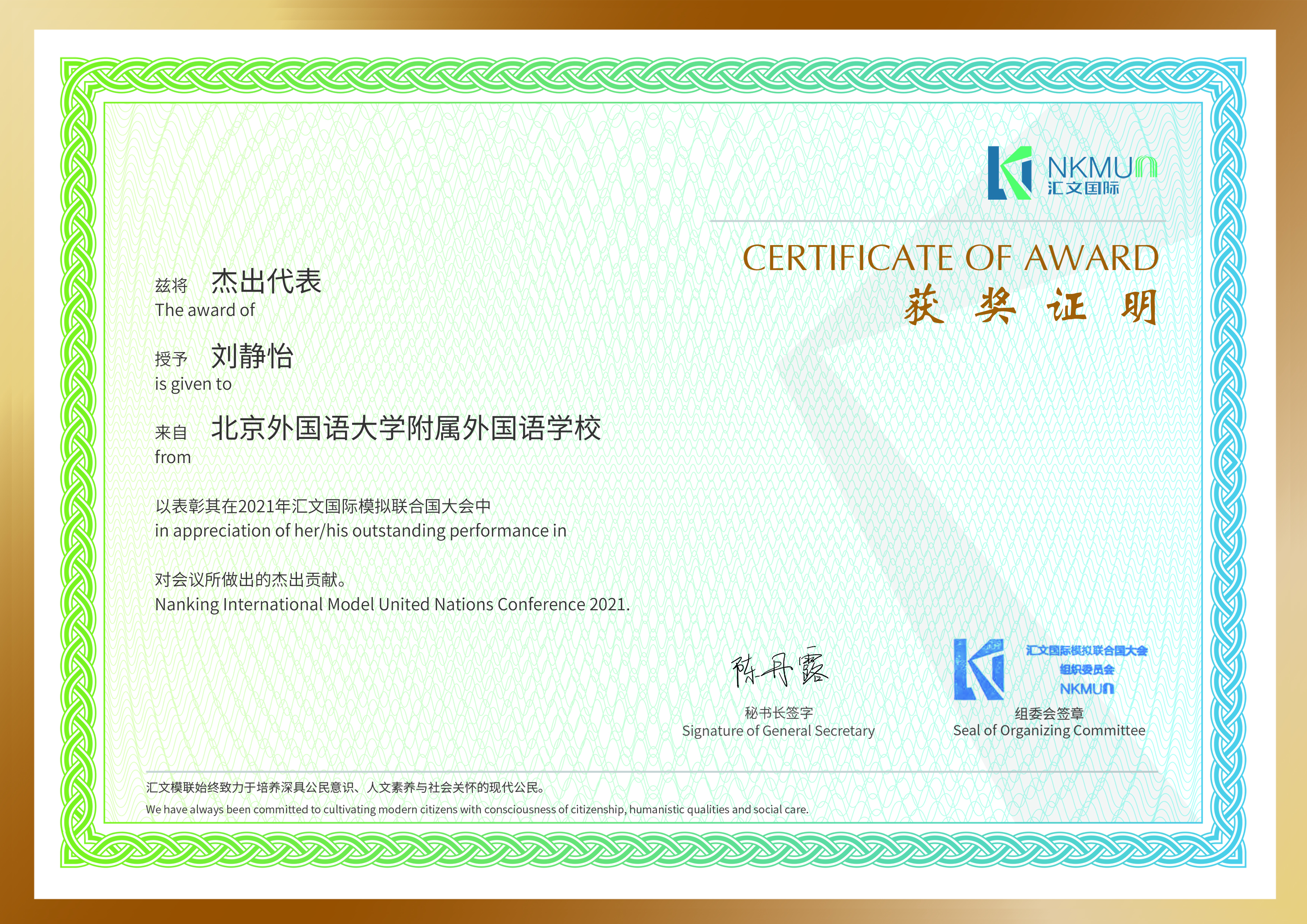 刘静怡在高中有了许多的经历,接待了德国姊妹校的好朋友的回访,成功竞选班长、高中部学生会主席、高中团总支书记,几次参加模联联合国活动并获得杰出代表奖,这些经历使她获得了学科之外的锻炼,帮助她更加自信,逐渐清楚看到了自己的学习目标,未来的事业方向,因此在学科的选择上,也有了自己更明确的想法。