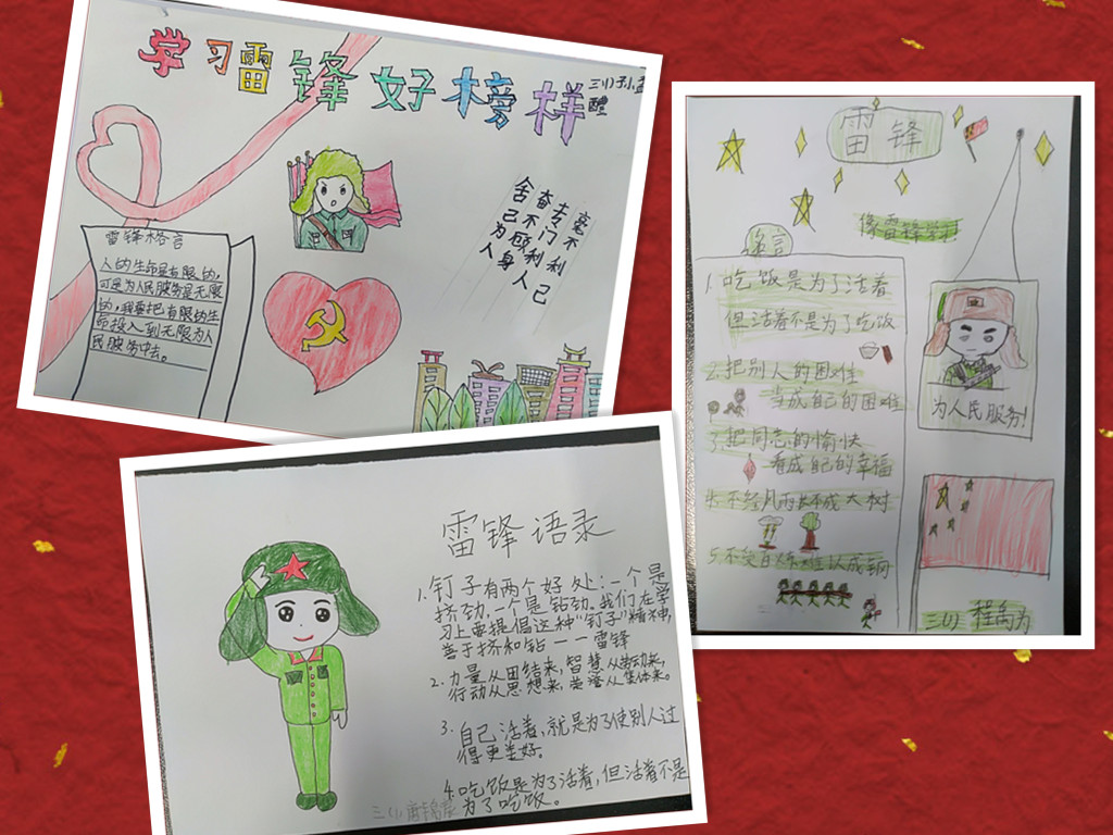 三年级学生和家长共同阅读《雷锋日记》,做雷锋语录手抄报,讲雷锋故事。