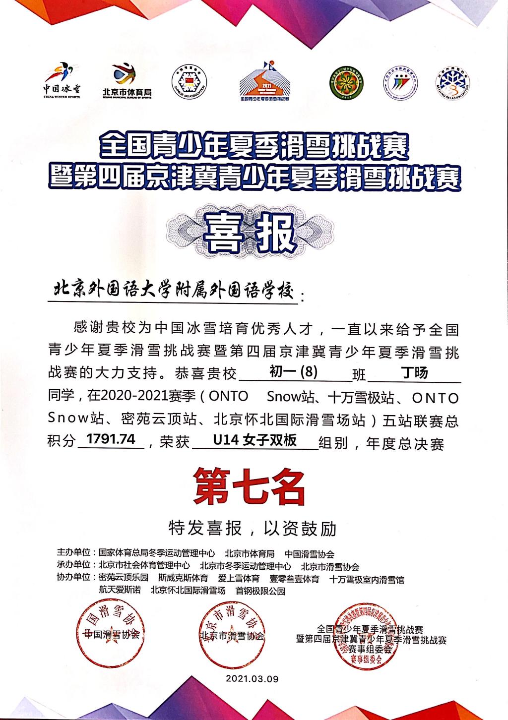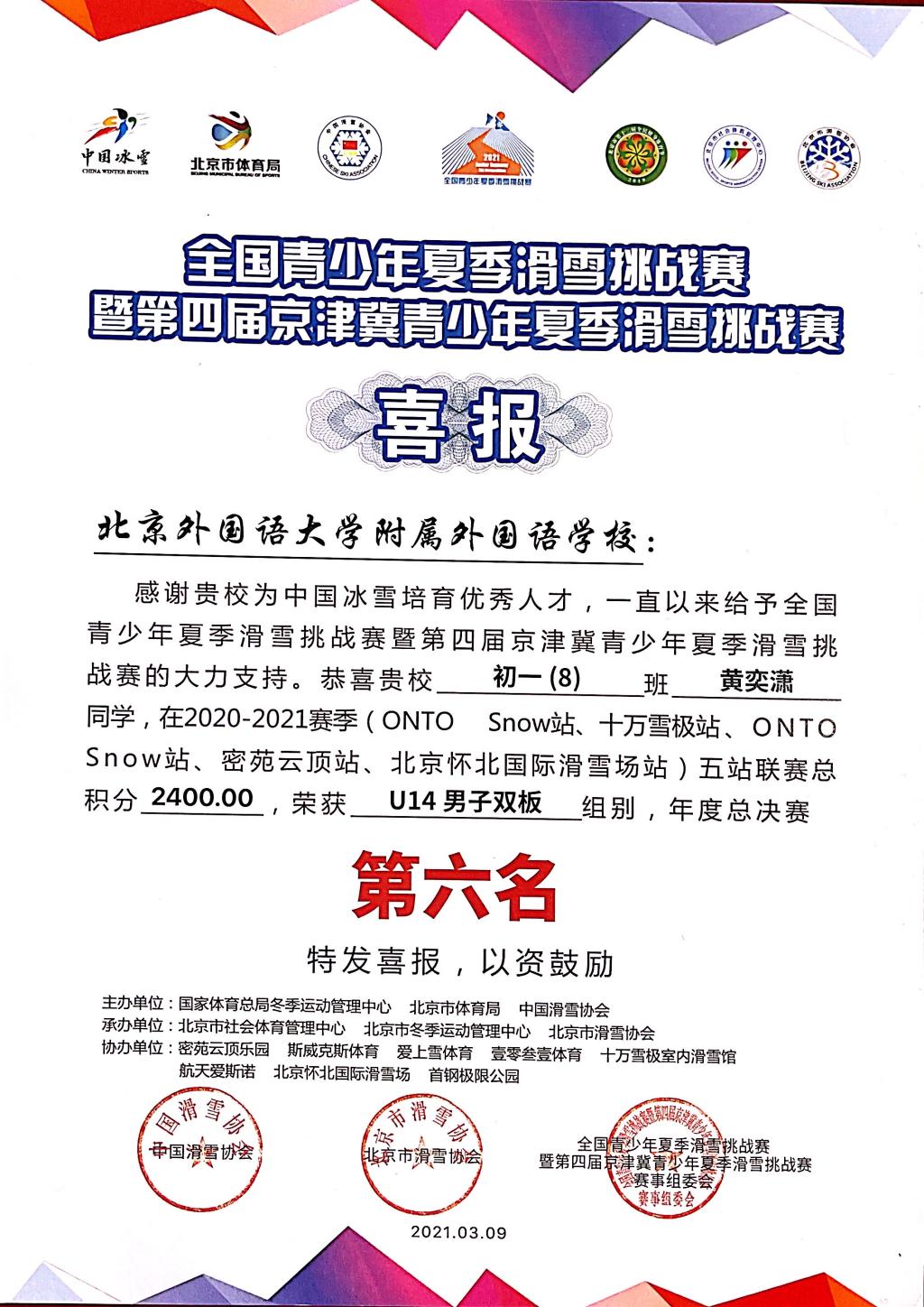 2021年2月28日,全国青少年夏季滑雪挑战赛暨第四届京津冀青少年夏季滑雪挑战赛总决赛在北京怀北国际滑雪场落幕。北京外国语大学附属外国语学校初一8班黄奕潇同学获得年度总决赛第六名,丁旸同学获得年度总决赛第七名的好成绩。
