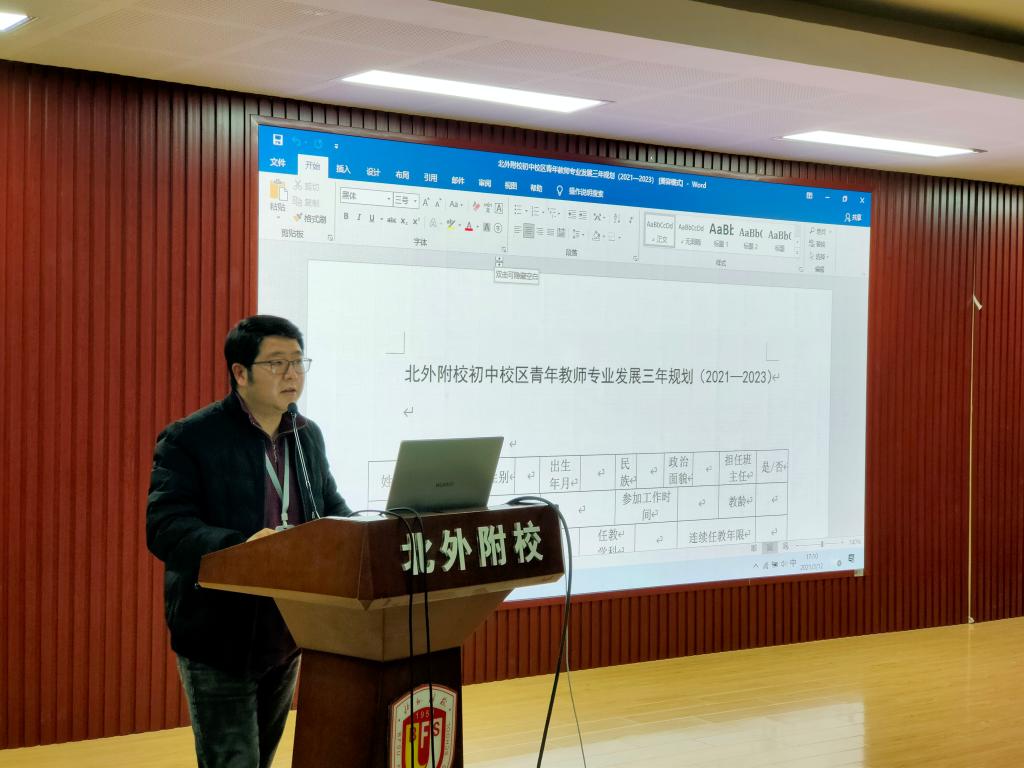 分享结束后,杨磊对五位教师的阅读分享予以了肯定,鼓励全体教师要保持阅读习惯,不断提升自我。随后,杨磊从专业发展现状分析、专业发展目标与措施、专业发展资源需求等方面为全体教师解读了《北外附校初中校区青年教师专业发展三年规划(2021-2023)》,要求青年教师根据自身情况制定未来三年的专业发展规划,使青年教师的职业发展更具目的性与计划性。