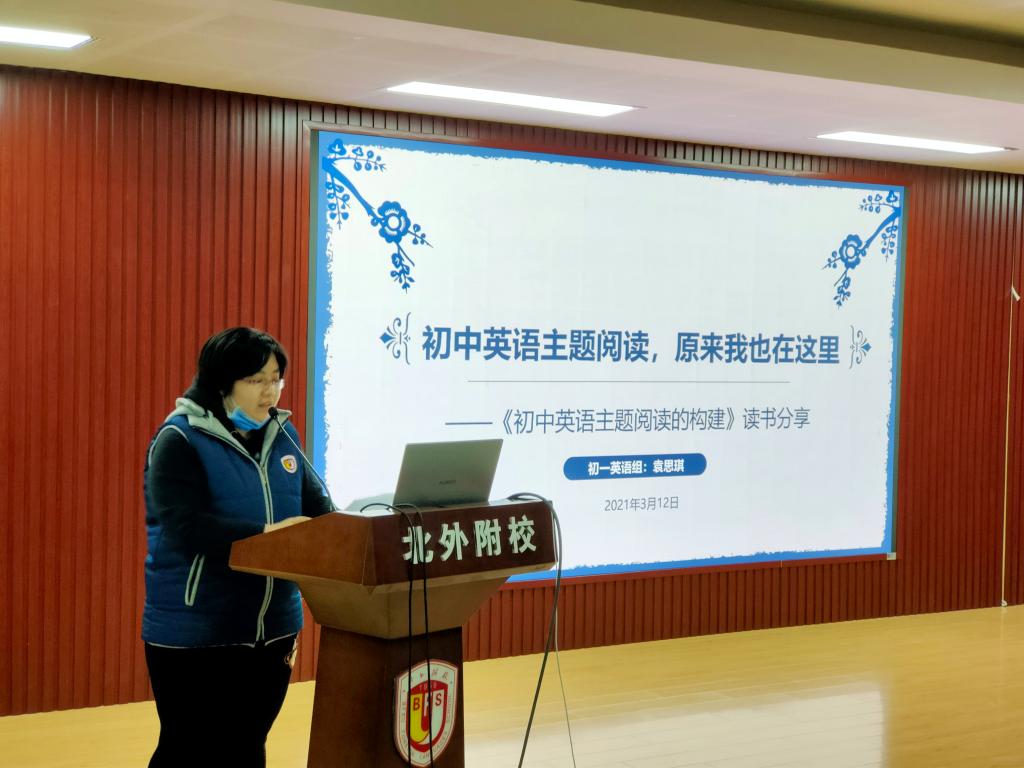 英语教师袁思琪阅读的书籍是《初中英语主题阅读的构建》。她以“原来我也在这里”为主题,从“众里寻他千百度:全书梗概”“云开雾散终有时:教育案例”“守得清心待月朗:个人感想”三个方面进行了分享。