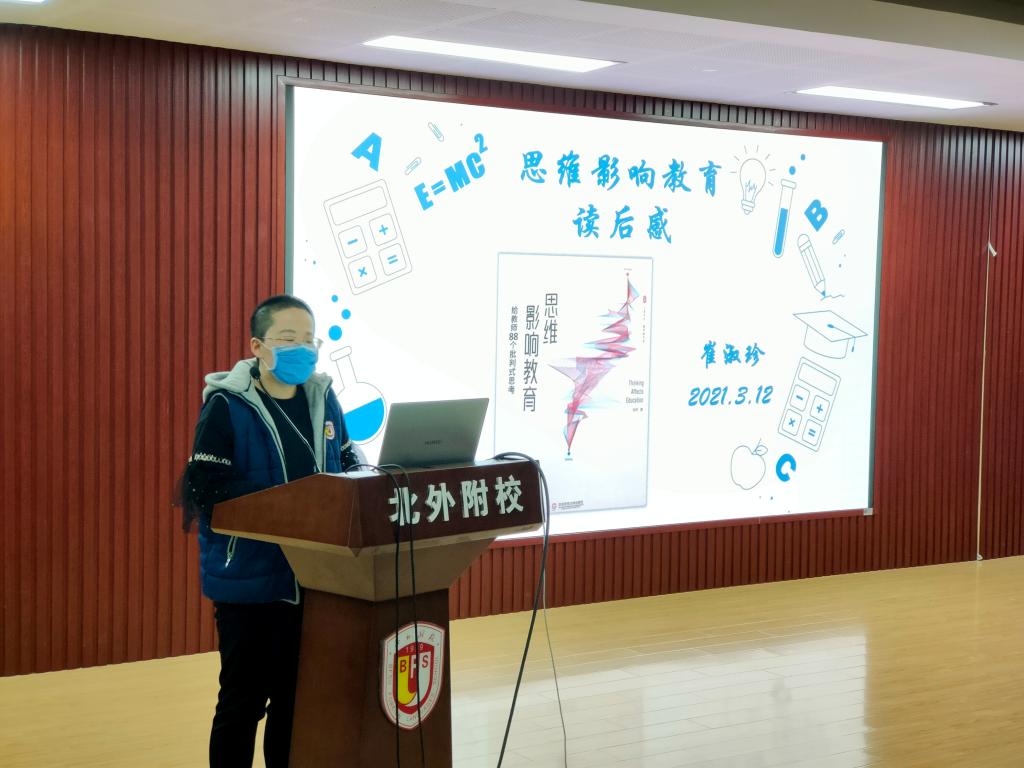 化学教师崔淑珍用幽默风趣、通俗易懂的语言和大家分享了自己读完《思维影响教育》这本书之后产生的思考。她从“教科研到底是什么?”“草根”科研发生的样子”两个方面切入,和大家对教科研这一话题进行了探讨,分享了自己带学生做实验探究吸水口罩的经历,认为教科研没有那么神秘,离我们并不遥远。