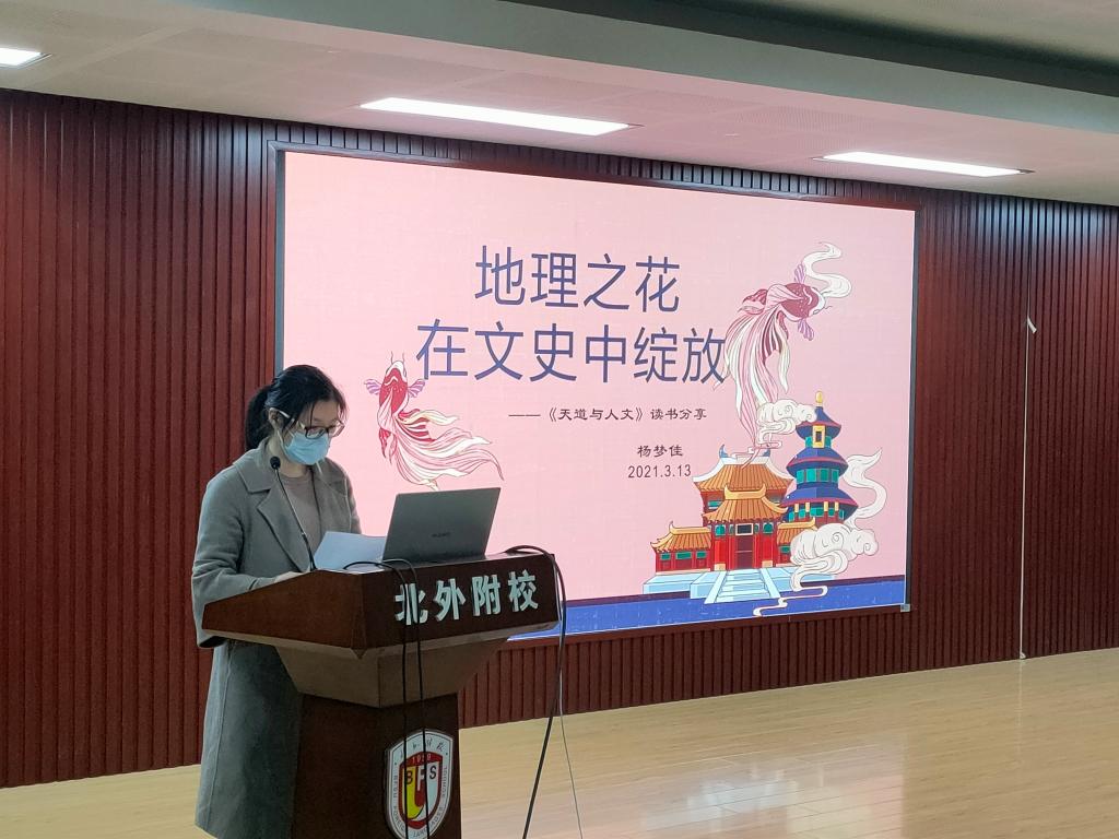 地理教师杨梦佳以“地理之花在文史中绽放”为主题,和大家分享了《天道与人文》这本书。她以书中“为什么要了解气候”这部分内容为例,谈论了书中内容对自己教学工作的启发。