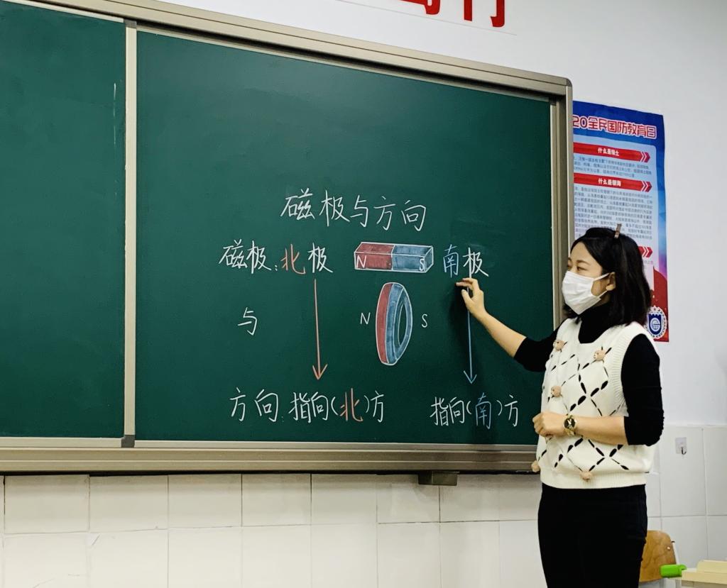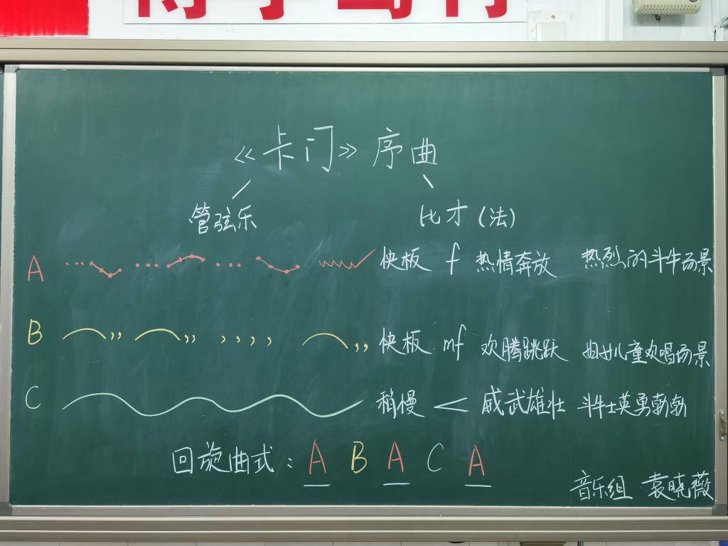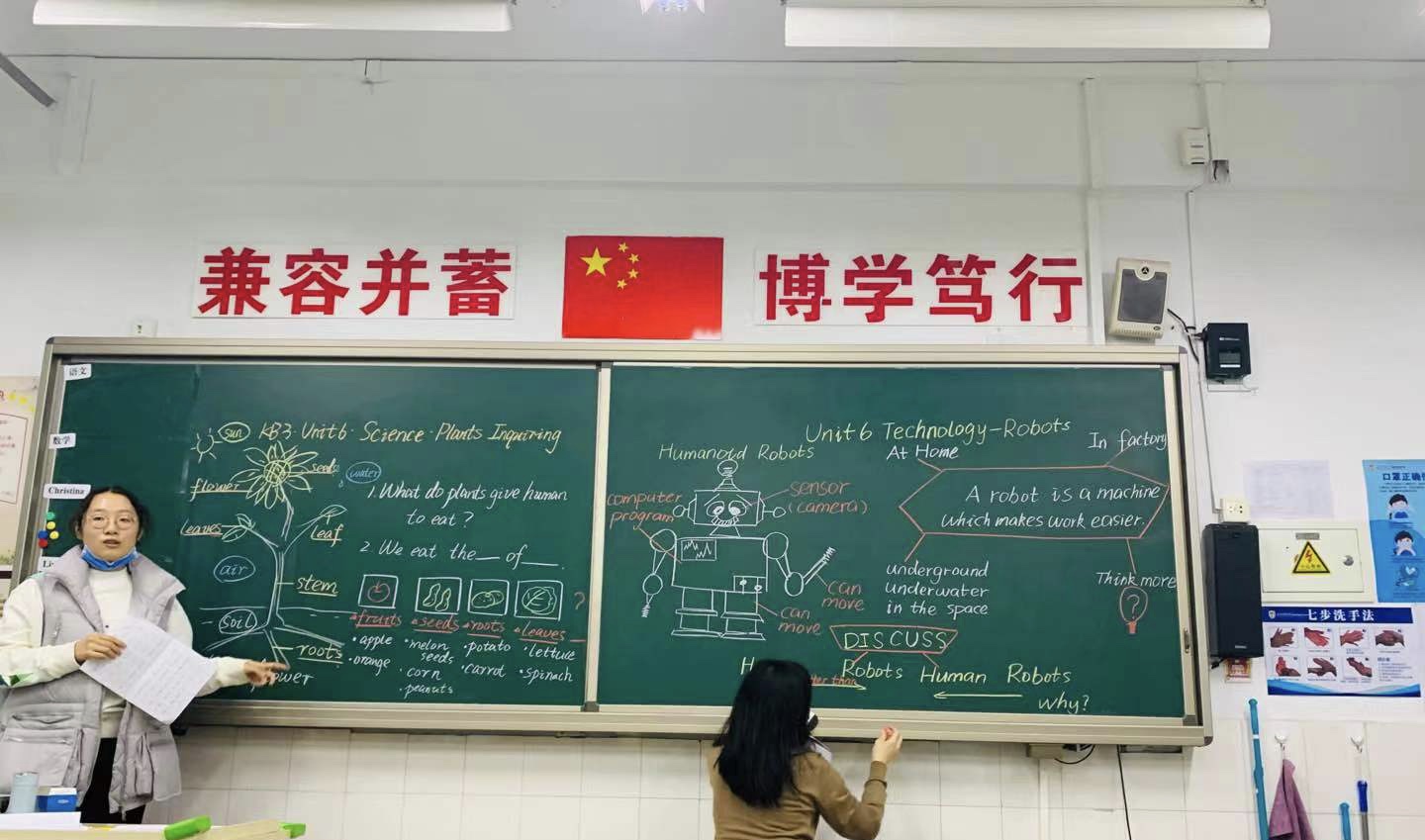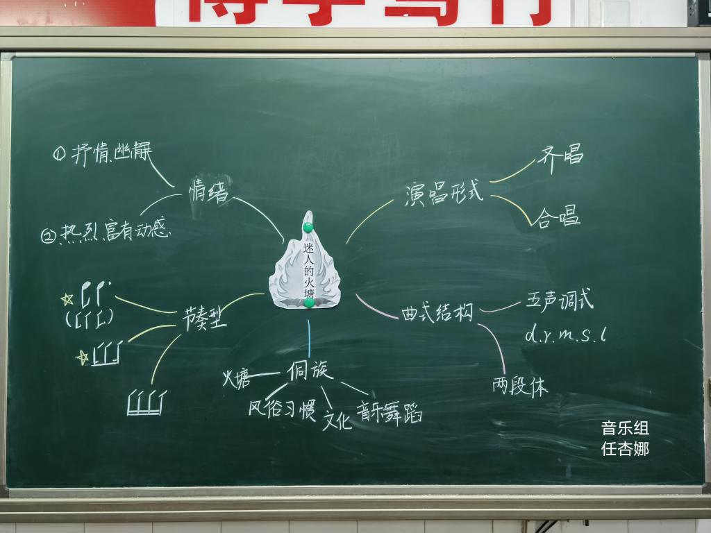 音、体、美、科根据本学科的特点在板书中以遵循教学规律,将教材的知识结构、学生认知结构、教师导学结构有机结合为根基,将抽象的知识形象化,大胆创新增强课堂启发性和感染作用。音乐板书力求简约精当的文字、有趣曲谱音符相结合凸现韵律之妙。美术板书多使用图形示意法,将重点转化为好看的图案,更易于学生理解。巧用艺术字配以彩图,极富视觉吸引力和强烈美感,侧重培养学生的艺术品位。科学板书依托课标核心概念及科学知识体系,引发学生思维共鸣,关注发展和实验结论的生成过程,激发学生的爱好科技、乐于探究之精神。体育学科虽无板书展示,但专业口令、队列队形的实操一招一式也有板有眼;口令洪亮有力;队形动作整齐划一,展现了附校体育教师的良好风貌。