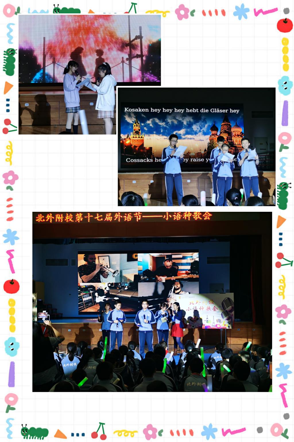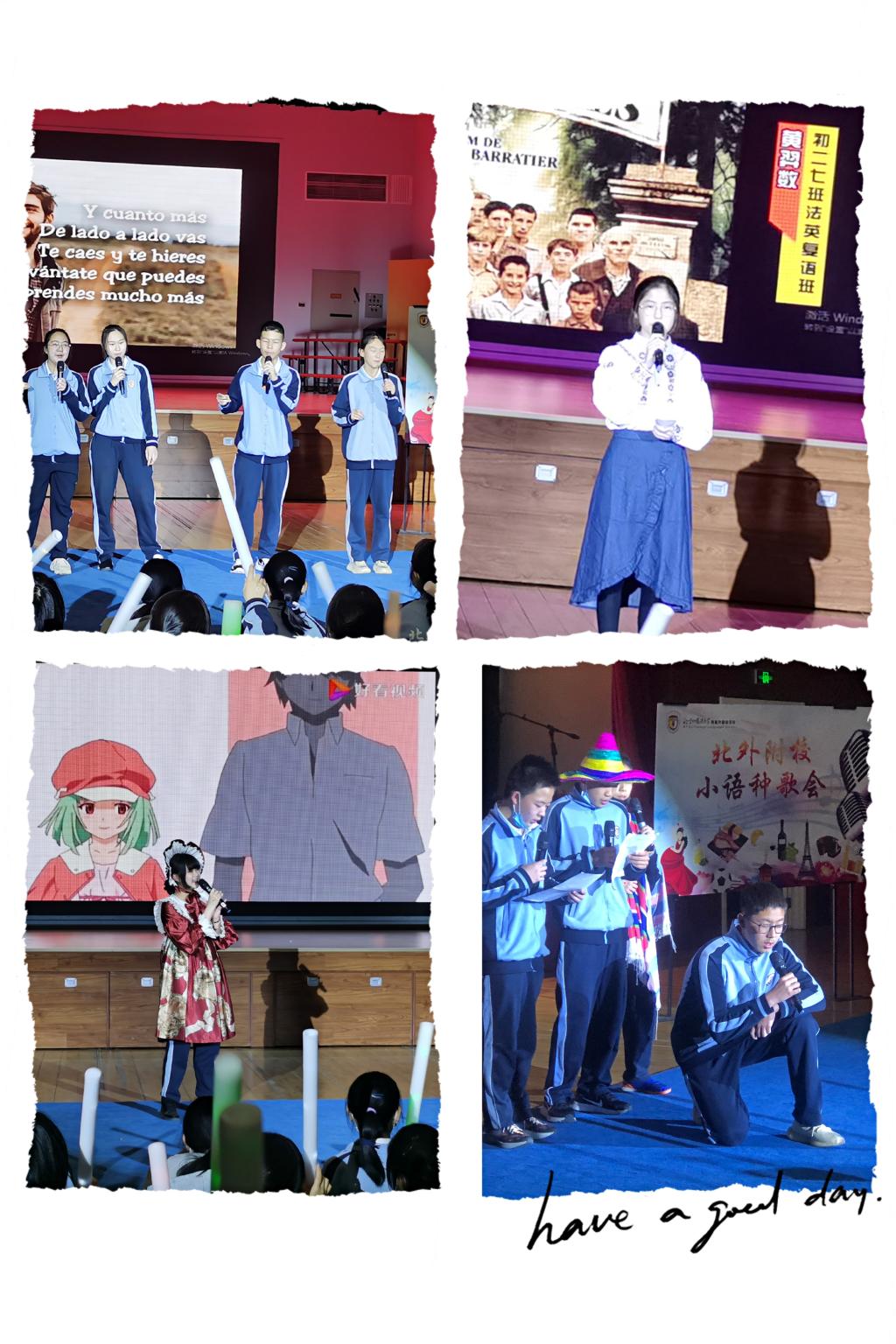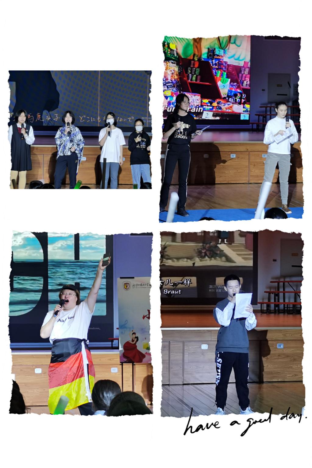 本次比赛在李杜洋、施昊、章祺涵、张腾演唱的德语歌曲《Moskau》中拉开了序幕,这首旋律动感的烧脑神曲瞬间点燃全场,选手们张弛有度的表演引起一片欢呼。接着,郭昱言、薛皓月演唱了日语歌曲《打上花火》,表演活泼可爱,发音清晰标准,淋漓尽致地展现了北外附校学子的复语语言能力及音乐素养。金鑫、卢馨然同学为大家带来的法语歌曲《On écrit sur le mur》,歌声婉转悠扬,娓娓动听,传递了爱与和平的美好主题。西语外教与凌圣暄、张一辰、邢之羽、那可馨同学们合唱的西语歌曲《Resistiré》,活力动感,听众们随着歌曲一起摇摆。最后刘品良、王晋阳、陈则行、李泊霖带来了歌曲《Silencio》, 他们的表演热情洋溢,激情四射,引爆全场,在场师生掌声四起,将本场氛围推向最高潮。