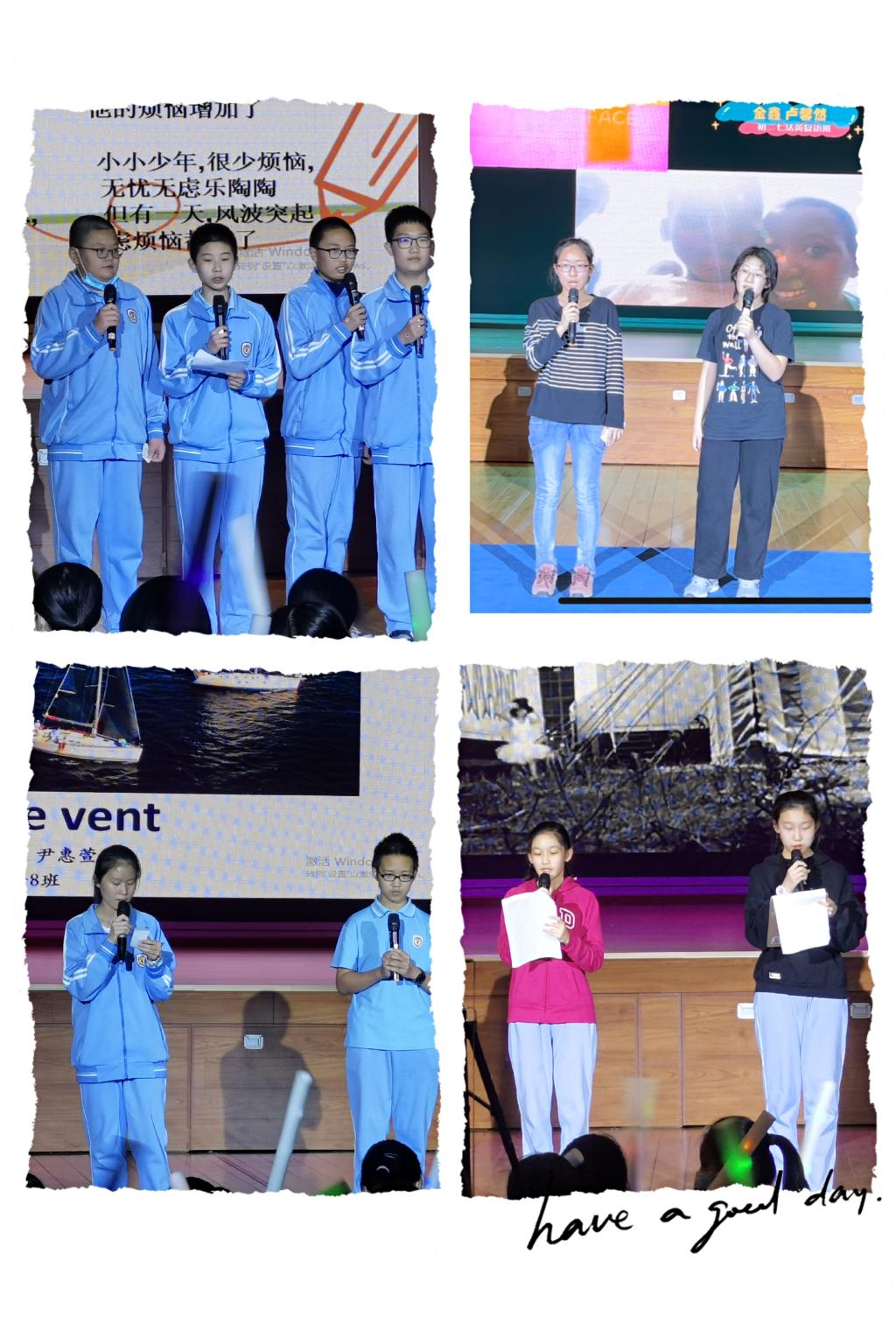 伴随着学生们的阵阵欢呼,本次小语种歌会活动也迎来了尾声。最终评委们从歌曲节奏、外语发音、歌唱技巧及台风表现等方面,综合评分评选出初二(7)班黄羿数获得一等奖,初二(9)班崔若曦、张奕妍、曲雯萱、李沁轩获二等奖,初二(9)班包天睿与初二(8)班刘品良、王晋阳、陈则行、李泊霖并列获得三等奖。另经过学生大众投票综合评选出初二(10)班李杜洋、施昊、章祺涵、张腾为“最佳人气王”。