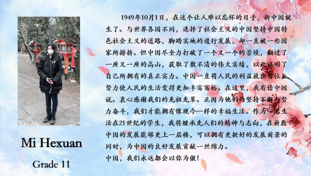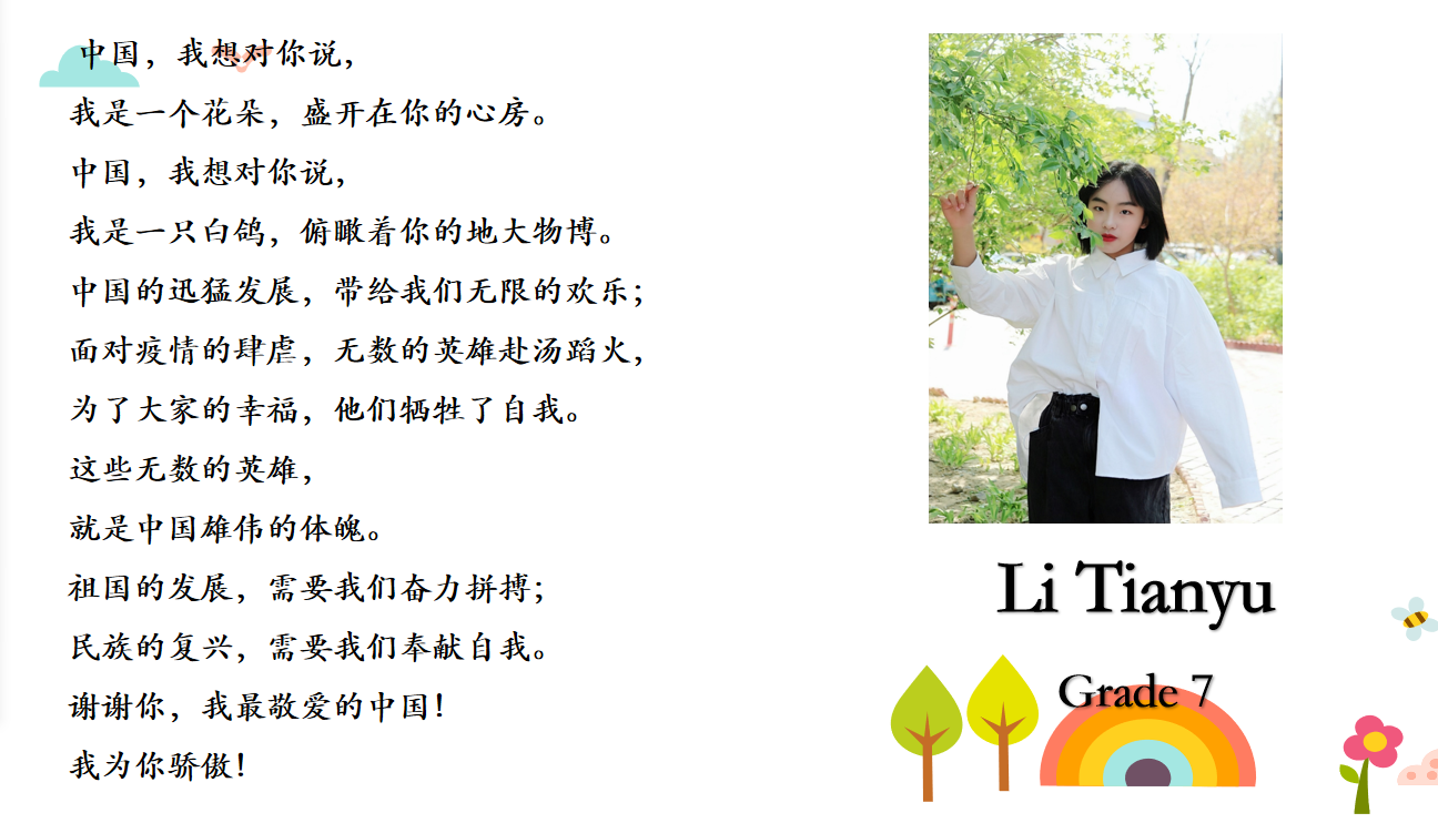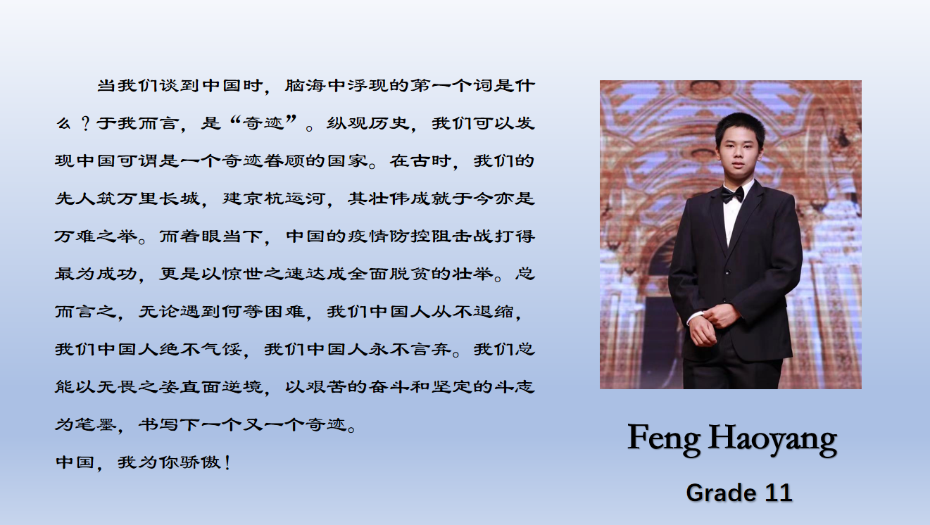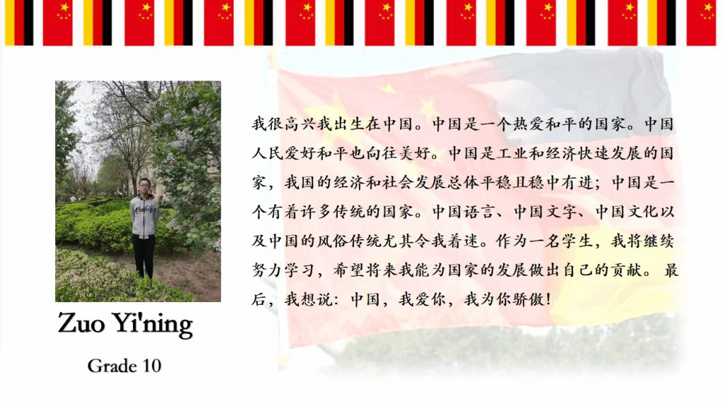 我校以培养“外语特长、文理兼优、综合素质全面的复合型国际化预备英才”为办学目标,素有“外交官摇篮”的美誉。从1959年办学至今,先后培养出一批优秀的外交人才和外语教育专家。在我校,学生在学习英语外还可以接触到第二外语。冯浩洋、李天予、左益宁、秘鹤轩、姚雨桐五位同学带来精彩的多语种演讲,演讲的主题是“China,I have something to say to you.”他们富有感染力的语言和优美的语音语调,充分展示了我校中学生的外语风采。