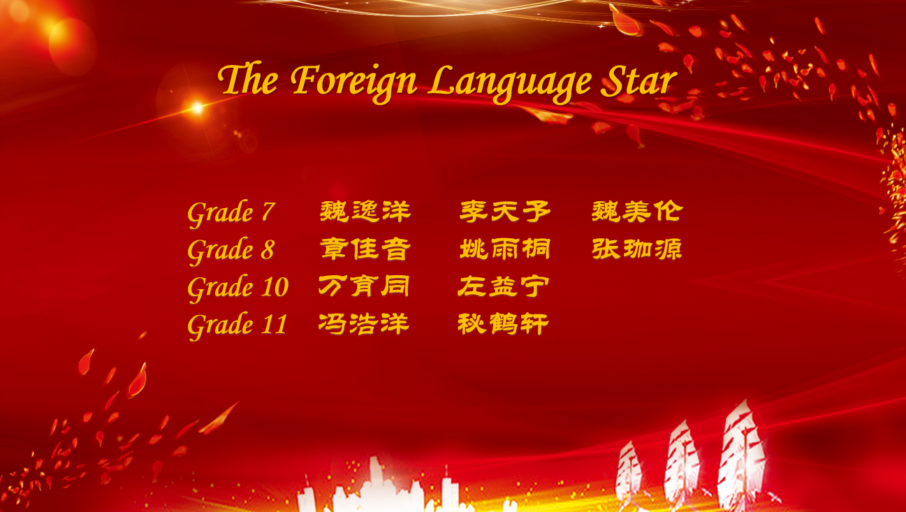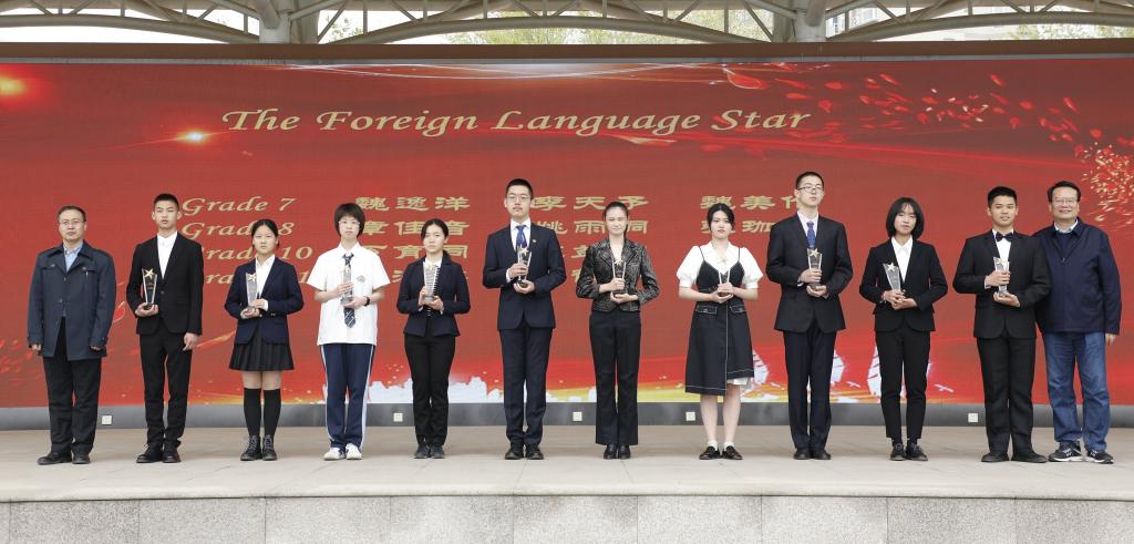 经过个人申报、年级推选、校区评选等环节,魏逸洋、万育同等10名同学获得第17届“外语之星”荣誉称号。这些同学在过去的一年中在外语方面表现优异,他们不仅成绩优秀,而且积极参加国家市区各级各类外语竞赛,并取得了骄人成绩。林卫民校长和高雁鸣副校长共同为获奖学生颁发“外语之星”奖杯。