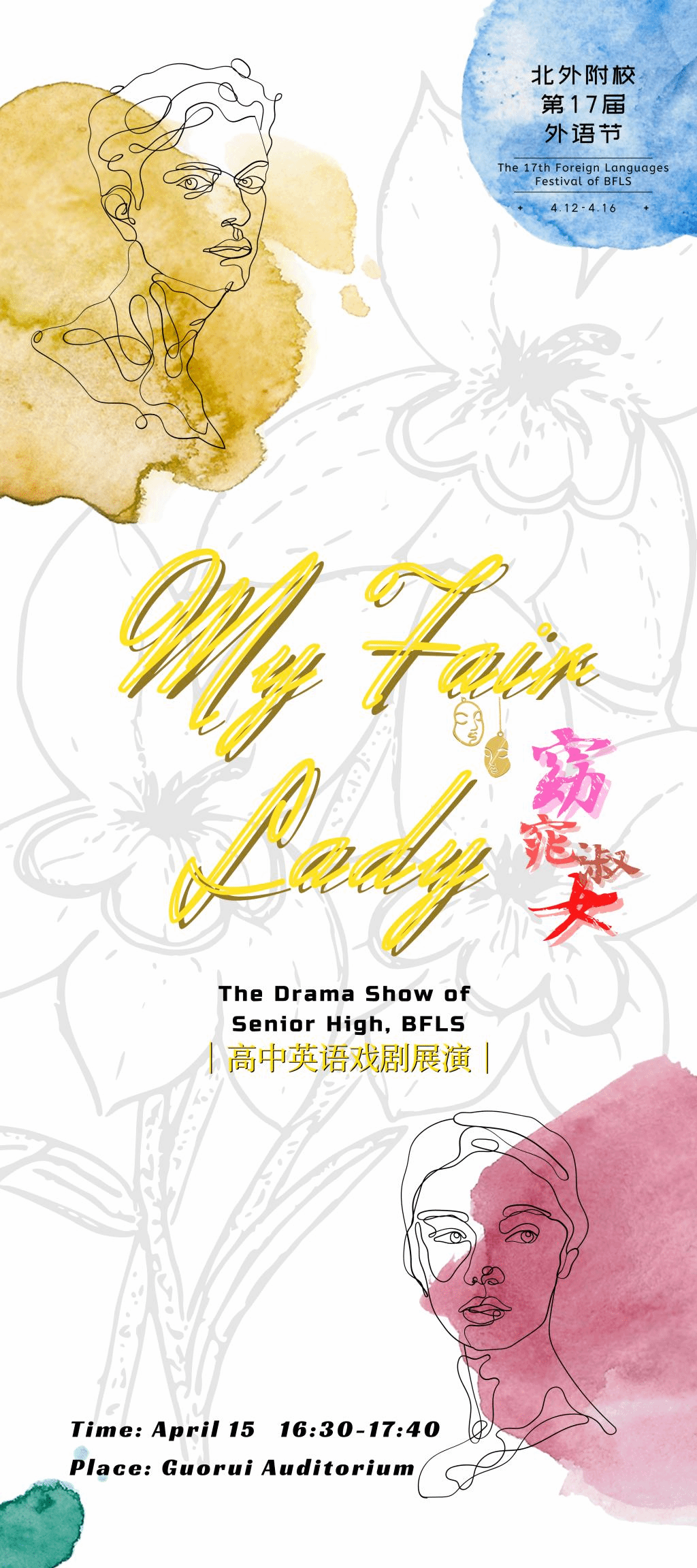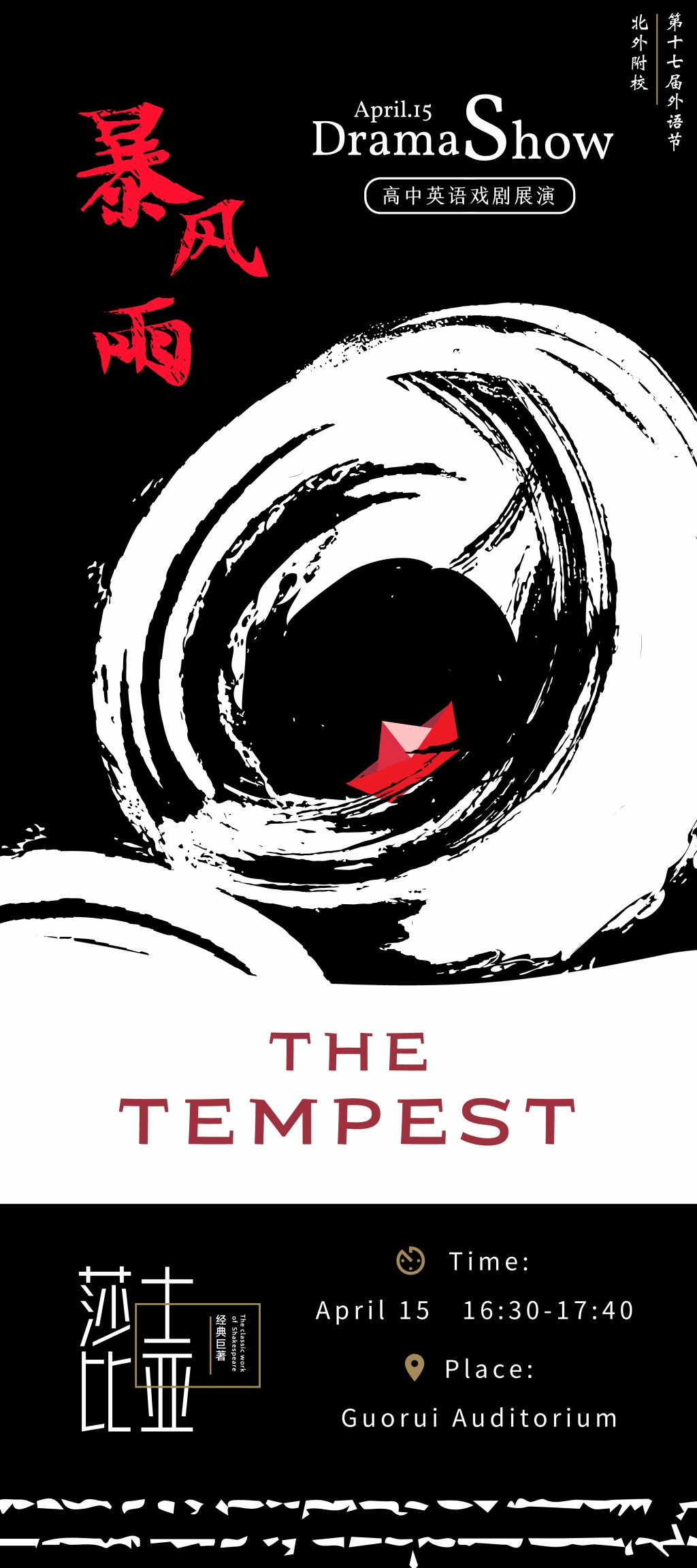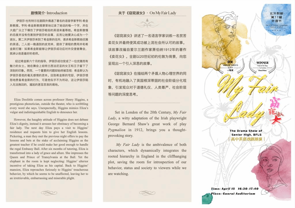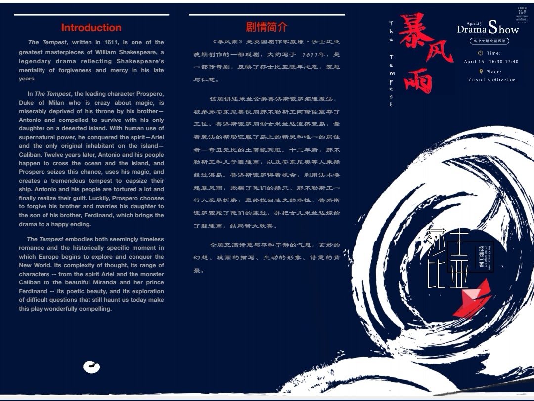 近年来,高中英语教研组一直坚持“将活动课程化”的理念,以设计和实施课程的方式精心策划、组织、设计每一项学科活动,坚持“以学生为主体”的理念,特别注重学生参与活动过程中的收获与成长。本次高中戏剧展演从戏剧服装、道具的准备,灯光、舞美的设计,从排练到宣传海报、宣传彩页的设计,均由学生在教师指导下完成。