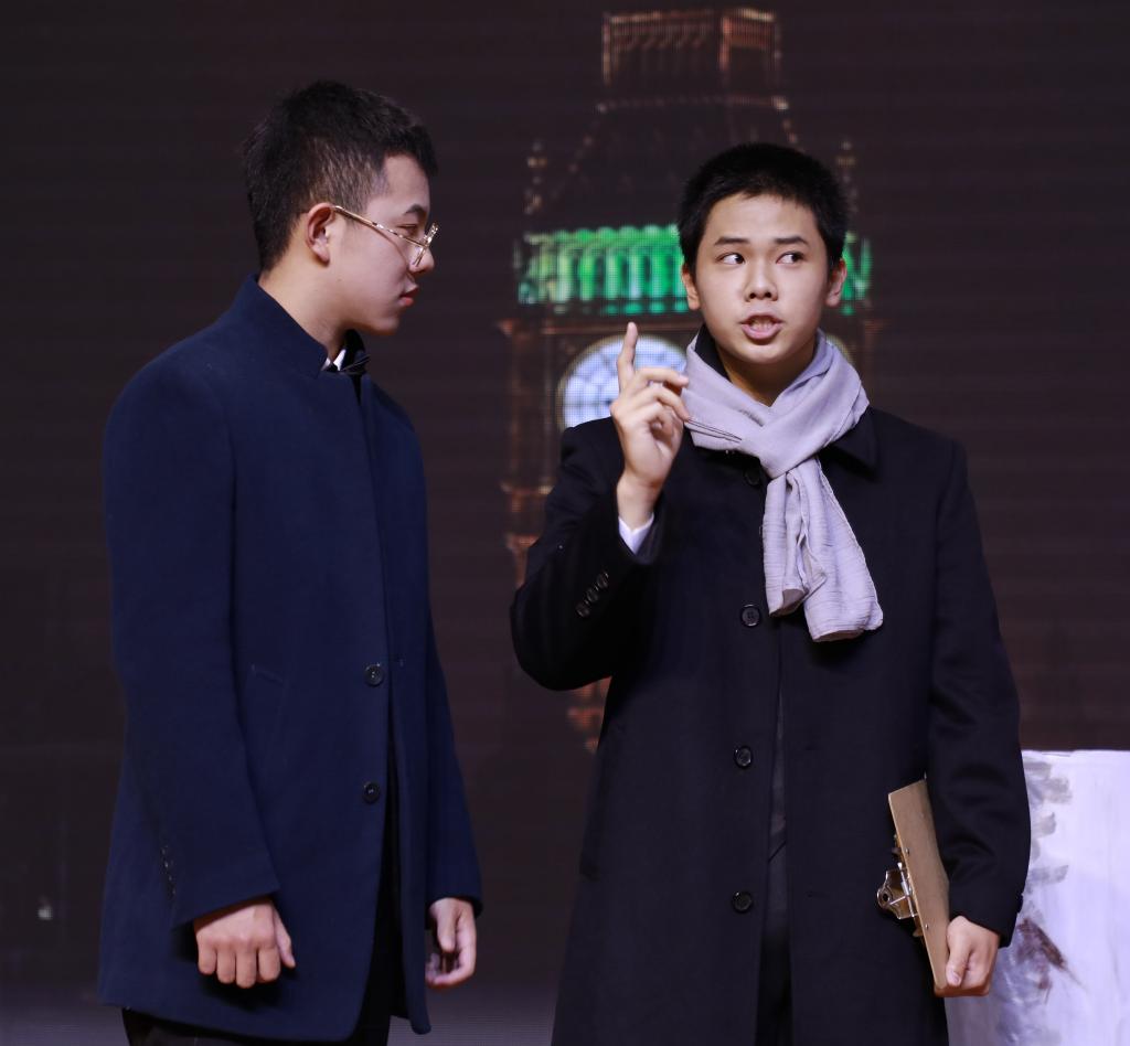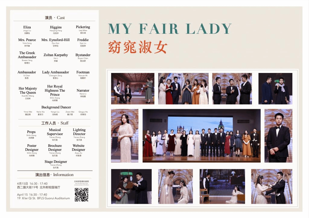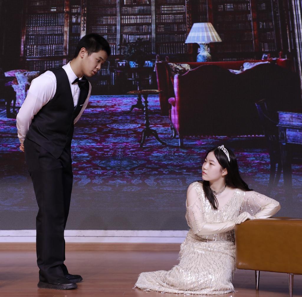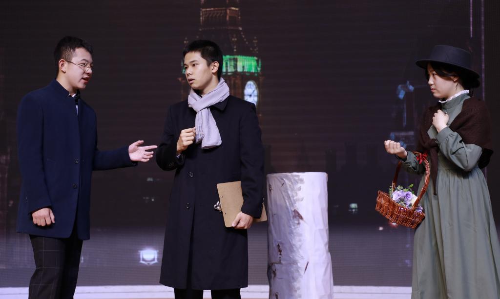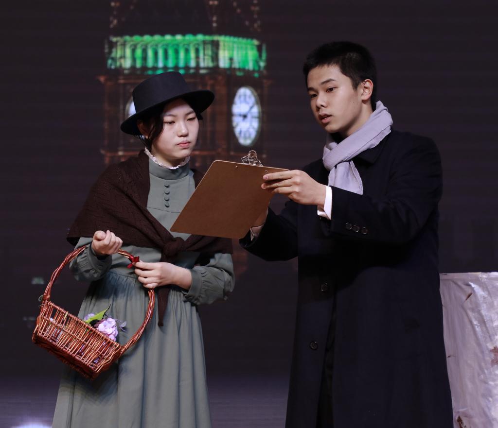 接下来闪亮登场的是学校的经典剧目《My Fair Lady》(《窈窕淑女》)。改编自萧伯纳的经典剧作《卖花女》,该剧讲述了著名的语音学家教授希金斯训练贫苦的卖花女伊丽莎,并使其最终成功被上流社会所认可的故事。希金斯的傲慢、不屑与喜怒无常在冯浩洋的表演下得以完美地体现,而伊丽莎的倔强、坚持与娇憨也被刘静怡表现得淋漓尽致。各个人物在不同时期展现出来的或典雅高贵或粗俗泼辣的仪态和语音更是为该剧增色颇多。
