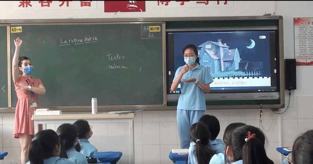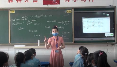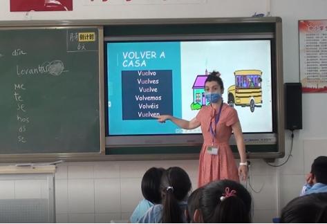 5月27日,西班牙语外教Inma De Lahoz Morales在初一(7)班开展了一堂西班牙语公开课。本课围绕“日常生活”这一话题展开,重点练习与日常生活相关的动词及动词短语,通过看图猜词、你“划”我猜、多米诺骨牌等丰富多彩的课堂活动加强、巩固学生对相关知识点的记忆与应用。