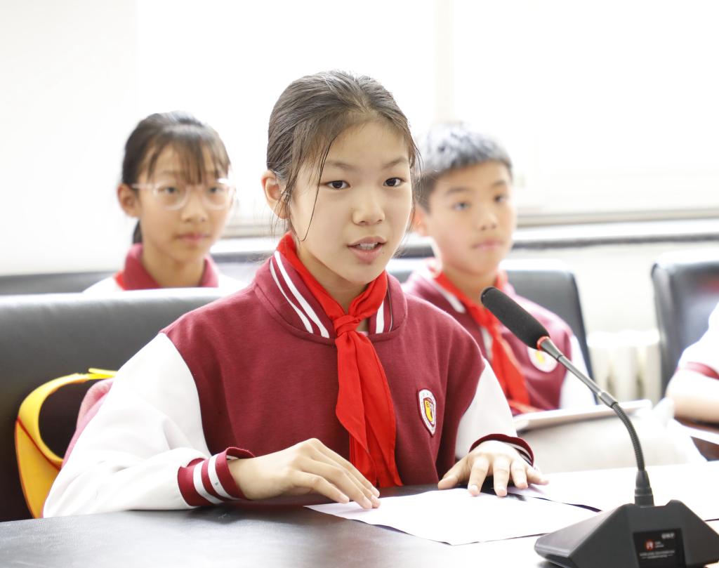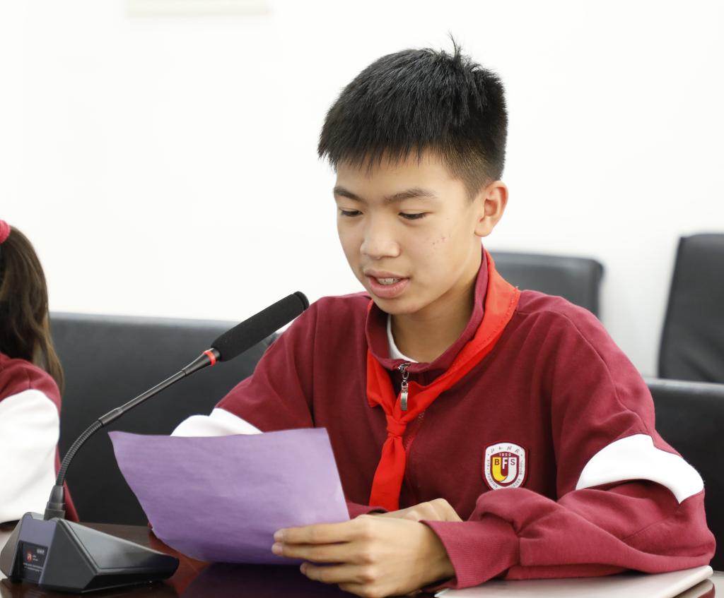 队员代表海淀区女子乙组跳远冠军姬奕彤同学和男子甲组60米亚军陶思辰同学进行发言,他们表示会把团结、努力、拼搏的体育精神融入学习和生活当中,奋发图强,不断超越自己。