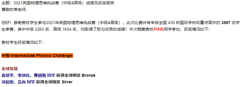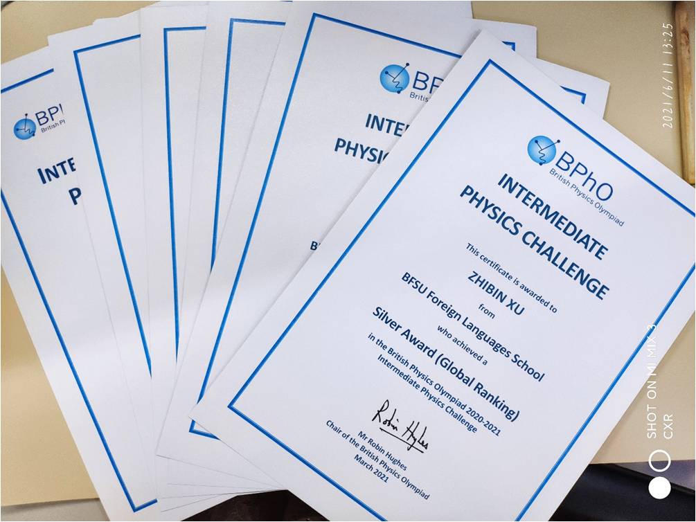 我校高中国际项目同学参加的被世界公认为“英国最高水平的高中物理竞赛之一”的英国物理思维挑战赛近日传来喜讯,此次比赛有来自全国430所国际学校和重点高中的3957名学生参赛,我校学子经过考前集中培训取得2银3铜的好成绩,常香然老师荣获优秀指导教师奖。参加挑战赛不仅是我校高中学子扎实专业素养与努力拼搏的表现,更是学校重视人才培养,积极鼓励学生参加国际竞赛、提升学生综合能力的体现。