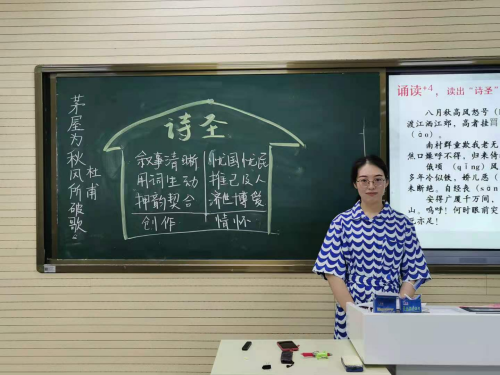 闫琪老师将《茅屋为秋风所破歌》的教学点定位在从叙事诗的文体特点和诗人的情怀两线并行的方式来解读诗文,深入体会杜甫“诗圣”之名。本堂课,闫老师以“这一天,诗人经历了什么”发问,引领学生理清文章结构,体会《茅屋为秋风所破歌》作为叙事诗脉络清晰,层层蓄势的叙事特点。以“这一天,看到一位怎样的诗人”为核心问题,引领学生通过品析关键词,想象画面,体会情感的方式,深入解读诗人推己及人、忧国忧民的圣人情怀。此外,闫老师抓住了歌行体诗歌的韵脚与诗人情感互相契合的特点,以韵脚切入,以诵读为线索串起整堂课。在吟诵中,让学生体会杜诗沉郁顿挫的美学格调,也让学生的情感在吟诵中深入文本,与诗人的情感碰撞。整堂课,古诗教学的重点、叙事诗的特点、文化的亮点三位一体,让叙事古诗教学落到实处。