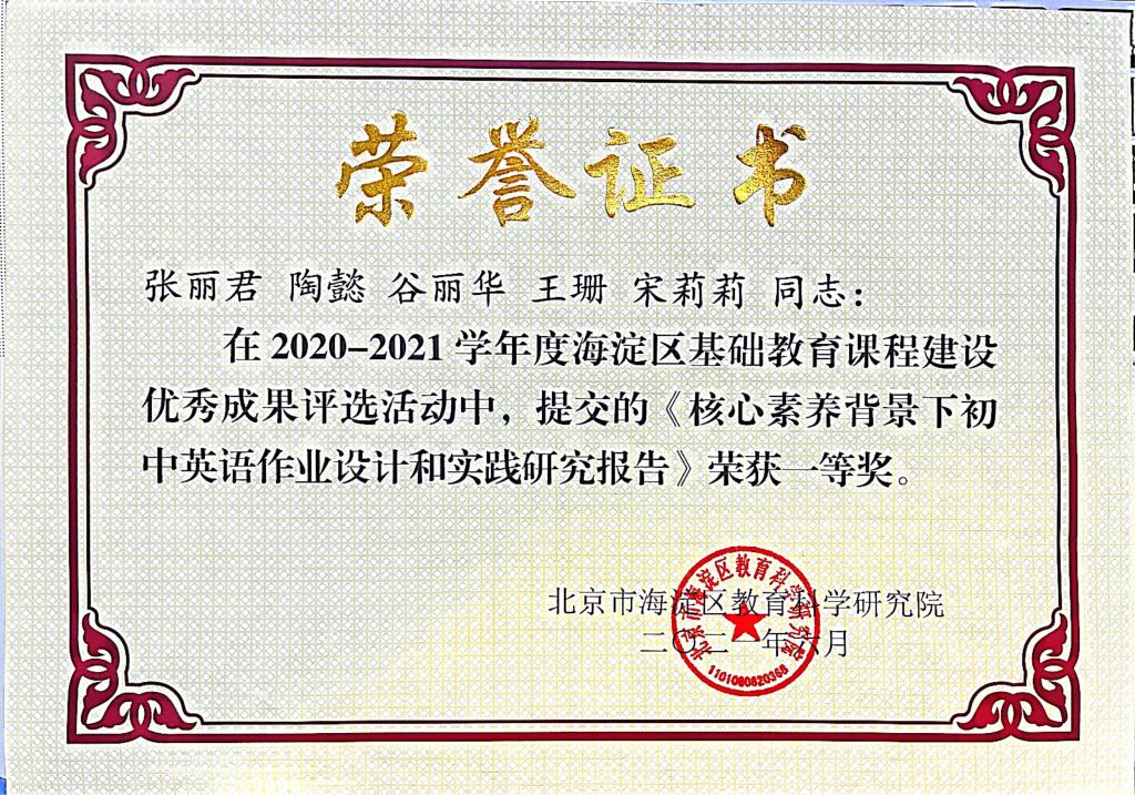 近日,我校初中校区参选的课程成果在2020-2021学年度海淀区基础教育课程建设优秀成果评选活动中获得佳绩。其中由张丽君、陶懿、谷丽华、王珊和宋莉莉撰写的《核心素养背景下初中英语作业设计和实践研究报告》荣获一等奖;由杨磊、曾菁敏、郭欣媛和蒋煜恒撰写的《“维克多雨果”中法姊妹校沉浸式研学课程建设成果》荣获二等奖。
