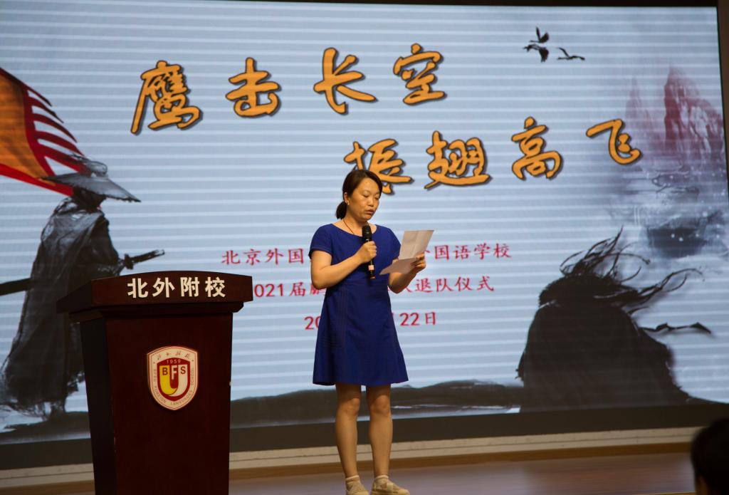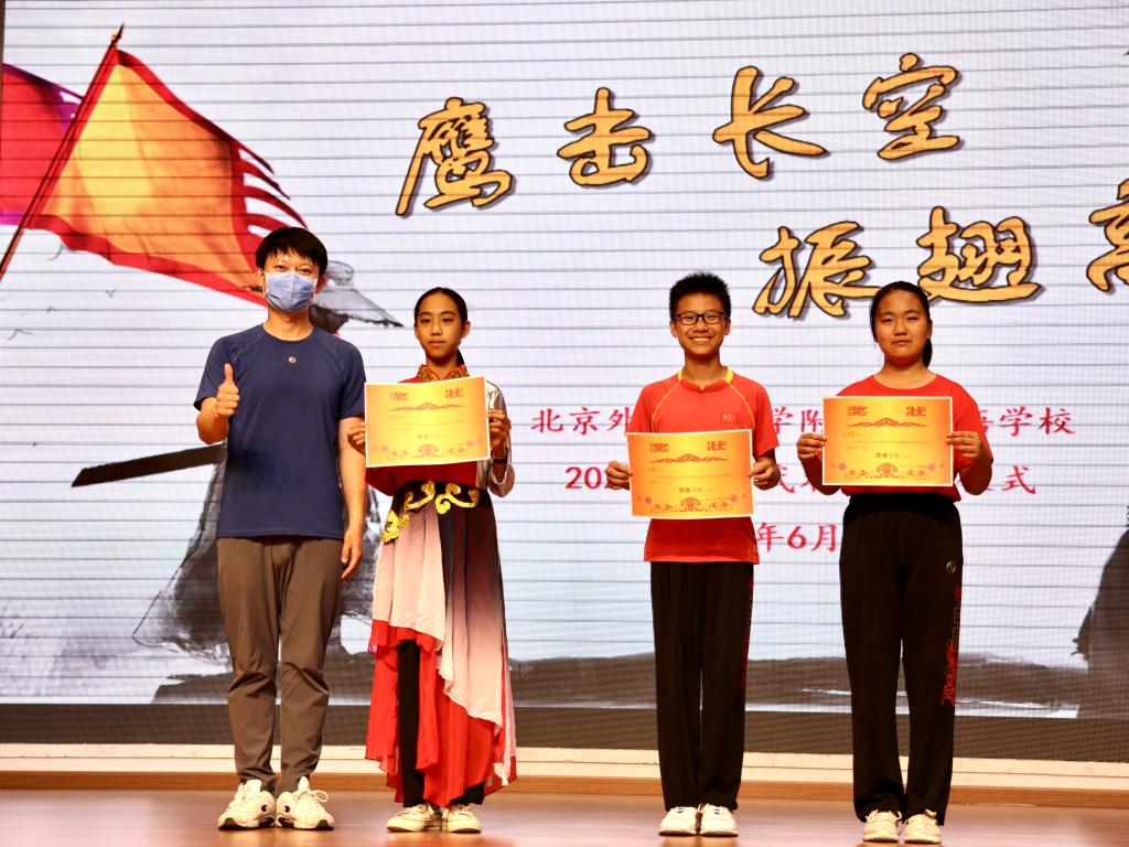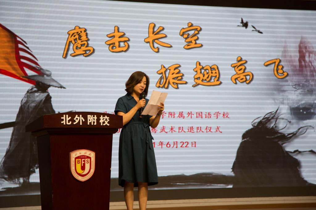 桃李不言,下自成蹊,梅晓焕老师作为教练代表为退队学生送上寄语。梅老师说:“爱徒们,在今后的人生道路上,你们要不怕困难,保持健康的身体和心态,养成良好的体育锻炼习惯,让自己拥有一个健康的体魄。讲武德、知感恩、懂孝顺、对待生活要积极乐观、心胸开阔。同时,珍惜友情,今天和你在一起的队员、同学将来都会是你一生的财富,在未来的人生道路上队友、同学、朋友可能比任何人陪伴你的机会更多,所以你要多交朋友,交好朋友,这样你才不会孤单。同时也要孝顺父母、感恩老师,用真心爱祖国、爱社会,努力学习,不断充实自己,做一个对社会有贡献的人。童年之后是成长,欢笑过后是稳重。不管走到哪里,请你们永远记住北外附校鹏鶱武术队这个优秀有爱的队伍,附校永远是你们最温馨的家,老师随时期待着你们回家”。