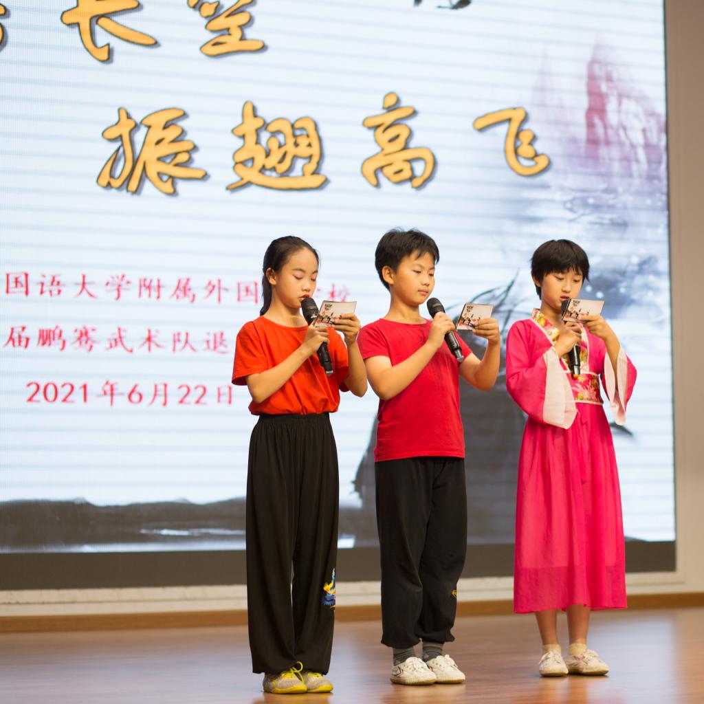 六月,是夏意初现的季节,是流萤染夏的季节,而对于鹏鶱武术队的三位队员们来说,这个六月,更是他们正式告别鹏鶱武术队的季节。2021年6月22日下午15:30,属于李博文、潘禧悦、苑芳菲三位同学的退队仪式,即将开始。