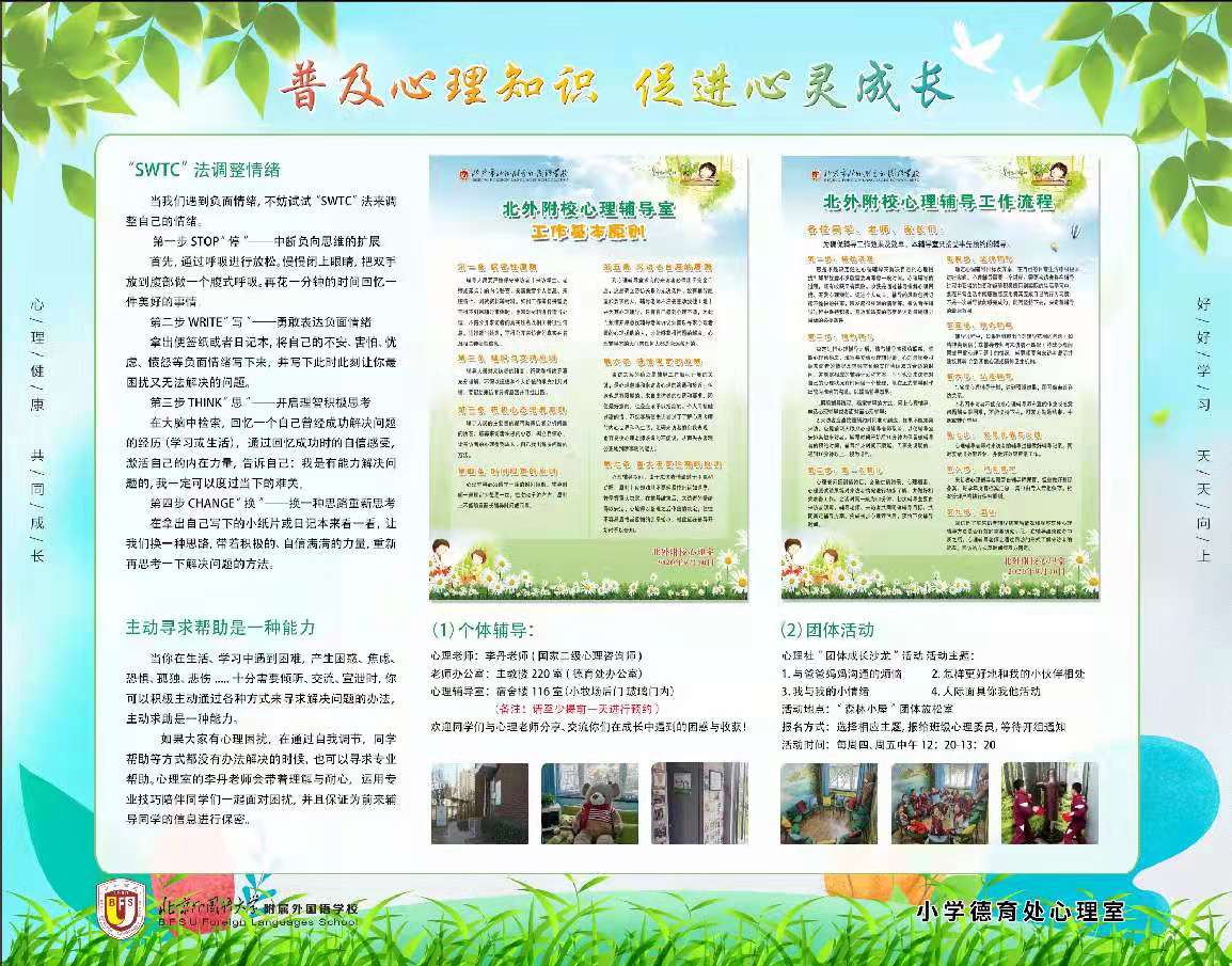 以积极心理学理念为主导,聚焦学生成长需求及凸显问题,预防心理危机,提升学生心理品质是市区教育行政主管部门近几年落实推进的重点工作,也是学生全面发展和健康成长的迫切需求,北外附校积极探索、认真践行。