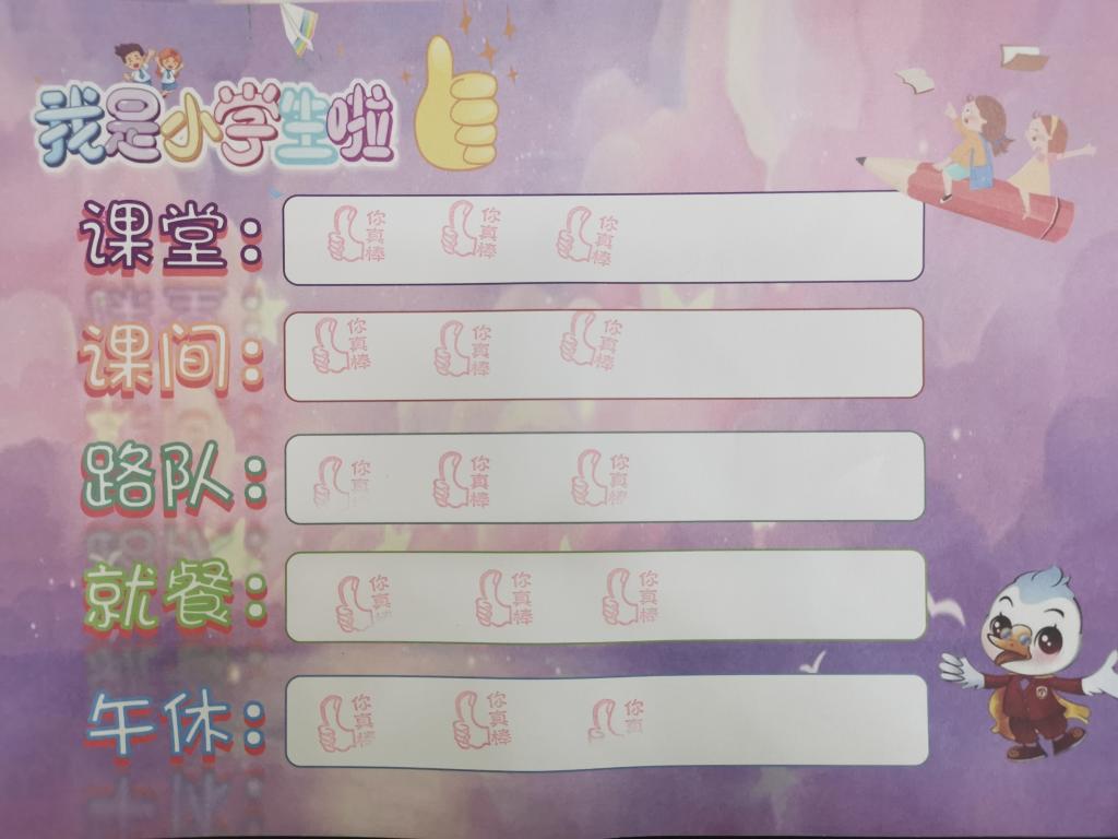 在本次试学课程中,各位老师把每个动作和任务的标准精确化、细致化,同时积极发挥孩子们的自主管理积极性,鼓励孩子发言,比如掌握正确洗手方法,整队练习等环节,很快就有初具领袖风范的孩子脱颖而出,在师生互评、生生互评中体验学习的乐趣,体会到小学生的责任感和集体归属感。老师们精心设计了试学卡片,从课堂、课间、路队、就餐、午休五个环节对学生进行综合评价,真正做到了“一课一标准,一动一评价”,帮助孩子们确立小学生的自豪感和责任感。