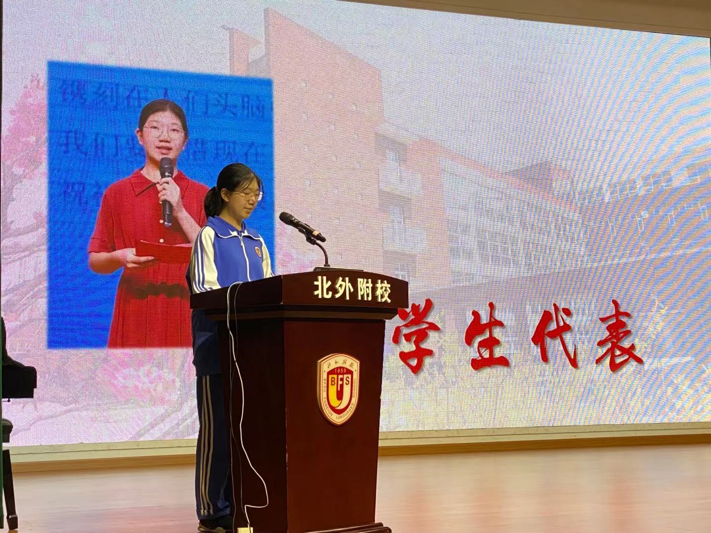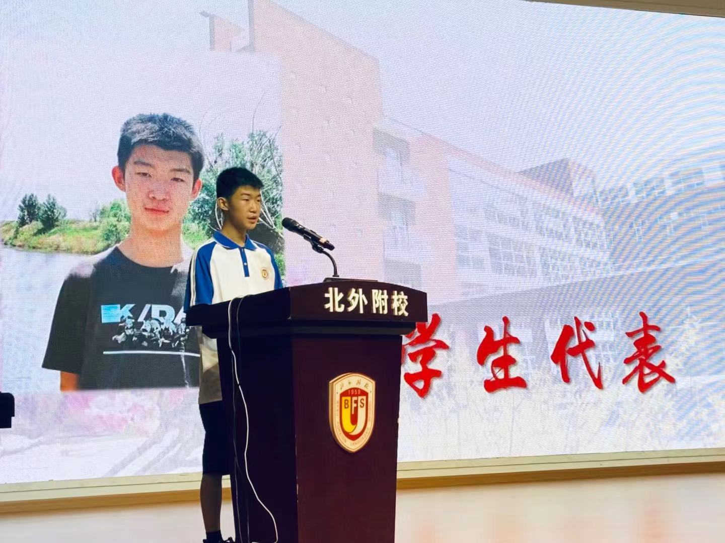 接下来,在北外附校生活和学习了九年的张孟东和李佳烨同学作为学生代表发言。新学期要树立新的目标,更珍惜时光,不急不躁,做脚踏实地的行动者,在人生最美的时光中绽放光彩。