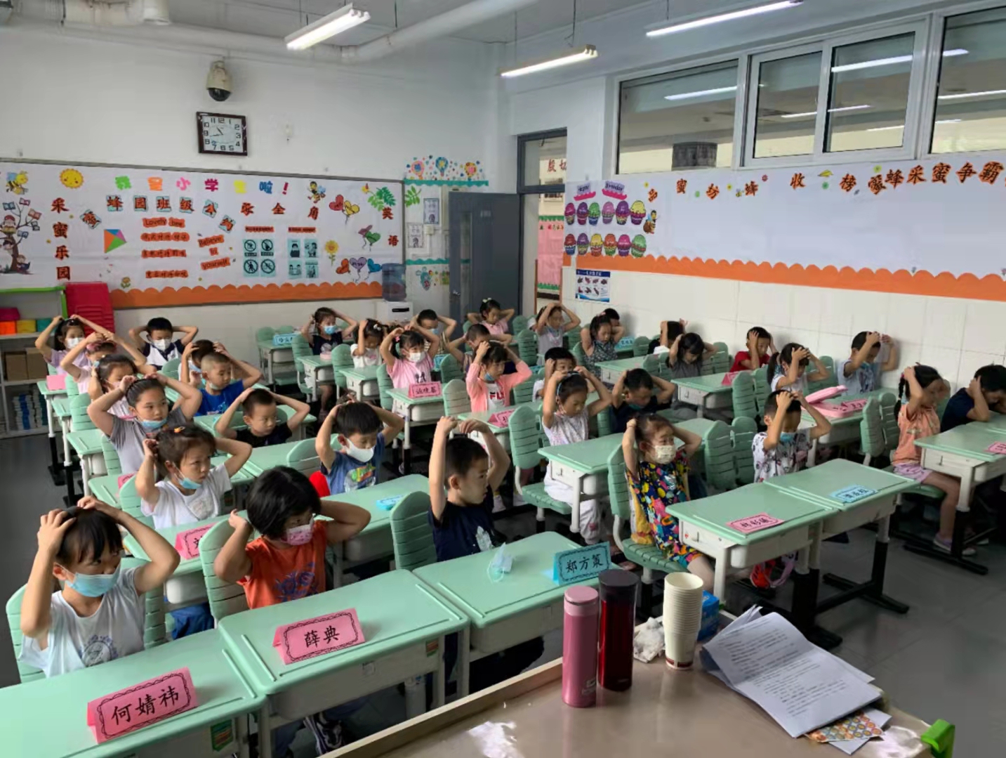校园试学第一天,一切都是那么新鲜、那么有趣。在老师的陪伴下,孩子们陆续进入教室。眼睛都睁得大大的好奇地东张西望。老师亲切的话语传来了,“小眼睛,看老师;小耳朵,竖起来……”一遍又一遍老师们温柔耐心地教孩子们如何端正姿势、如何举手发言、如何整理书本、如何站队出操、如何如厕洗手、如何午饭休息……一个个行为习惯被编成朗朗上口的顺口溜,孩子们记得快记得准,规则意识像一粒种子种在了心里面,这些行为准则将引领着他们在校园学习生活中的一言一行,引领他们慢慢长大。