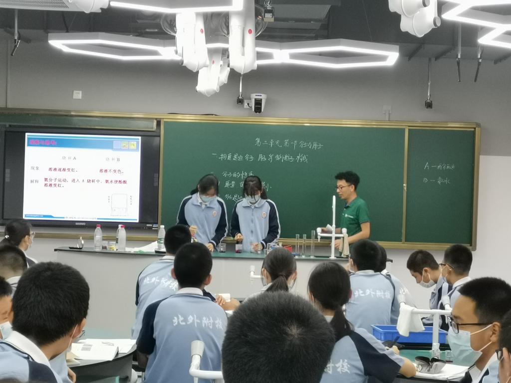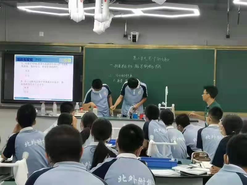 王老师用他幽默诙谐的语言和生动活泼的课堂给同学们展示了一个关于分子和原子的微观世界。课堂上同学们动手参与实验,上讲台演示实验,用自己的语言解释实验,这一系列的活动在和谐轻松的氛围中慢慢生成。
